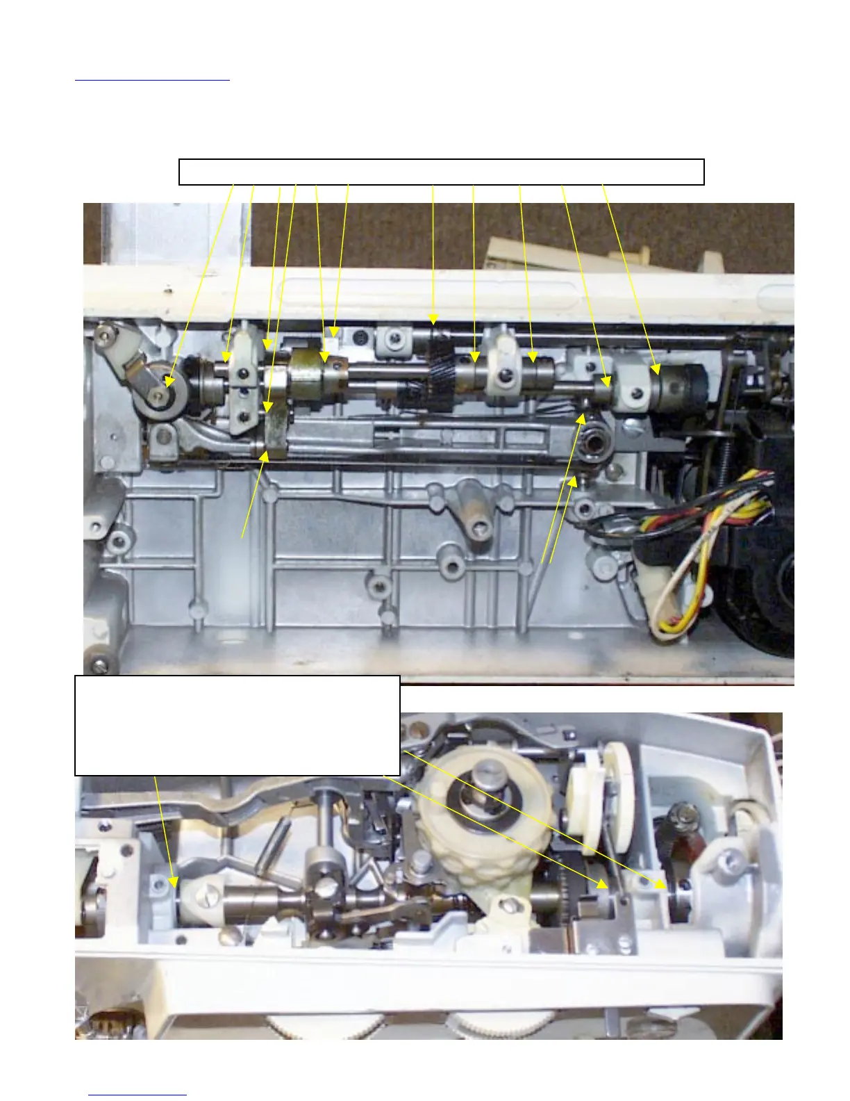 13. Ok, we’ve got the machine opened up. Blow all the lint out of the Bobbin Case area, Bottom Pan area, and Needle Bar area.