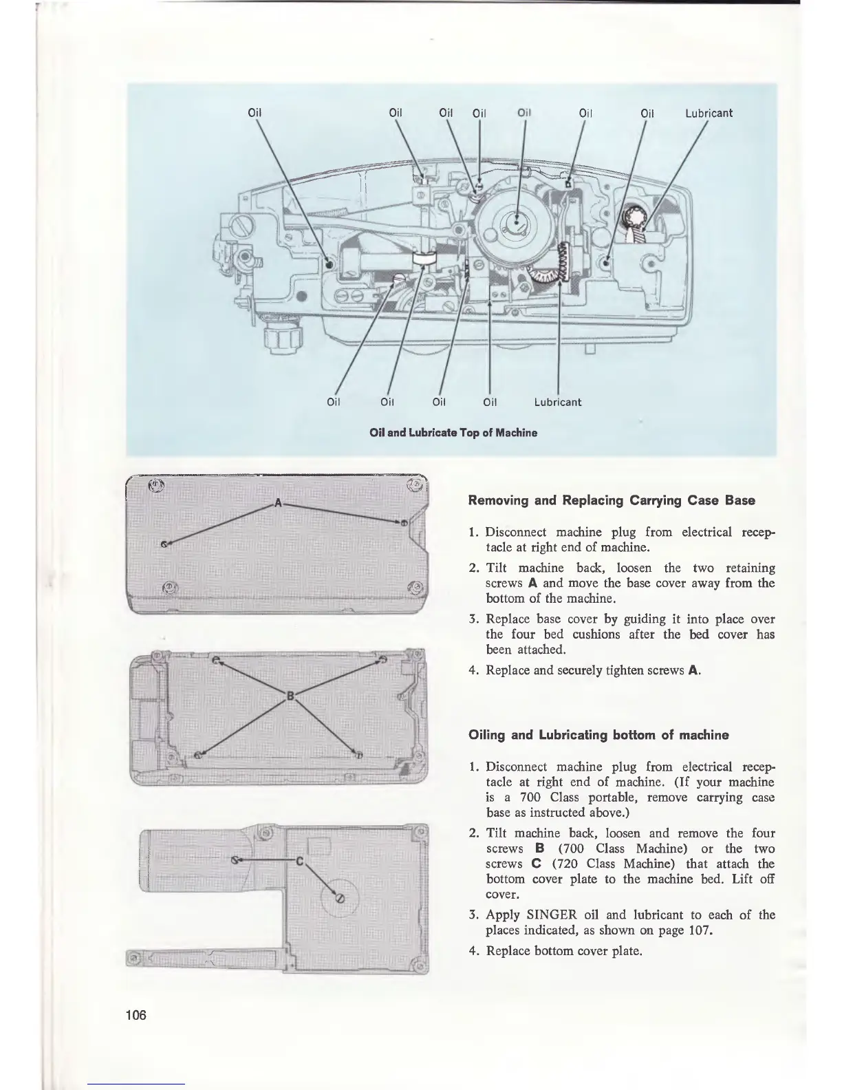 Singer 700 - Oil and Lubricate Top of Machine; Removing and Replacing Carrying Case Base; Oiling and Lubricating Bottom of Machine