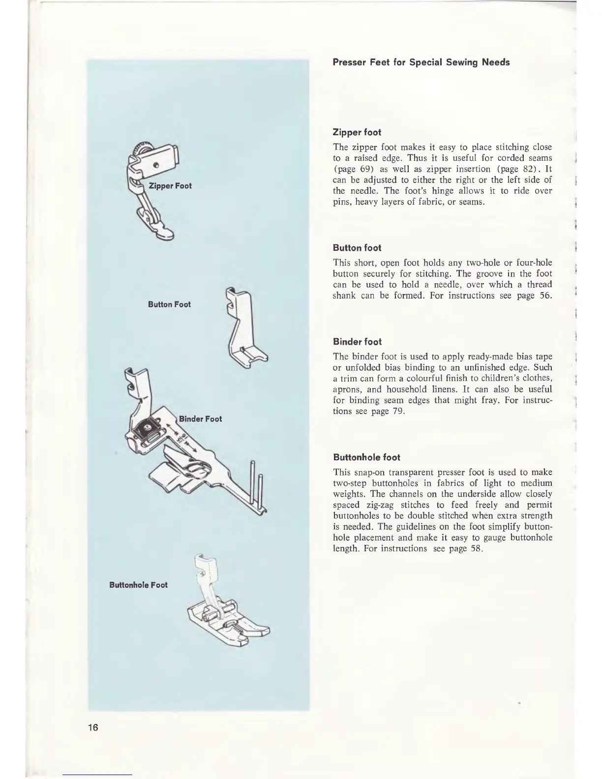Singer 700 - Presser Feet for Special Sewing Needs; Zipper Foot; Binder Foot; Buttonhole Foot