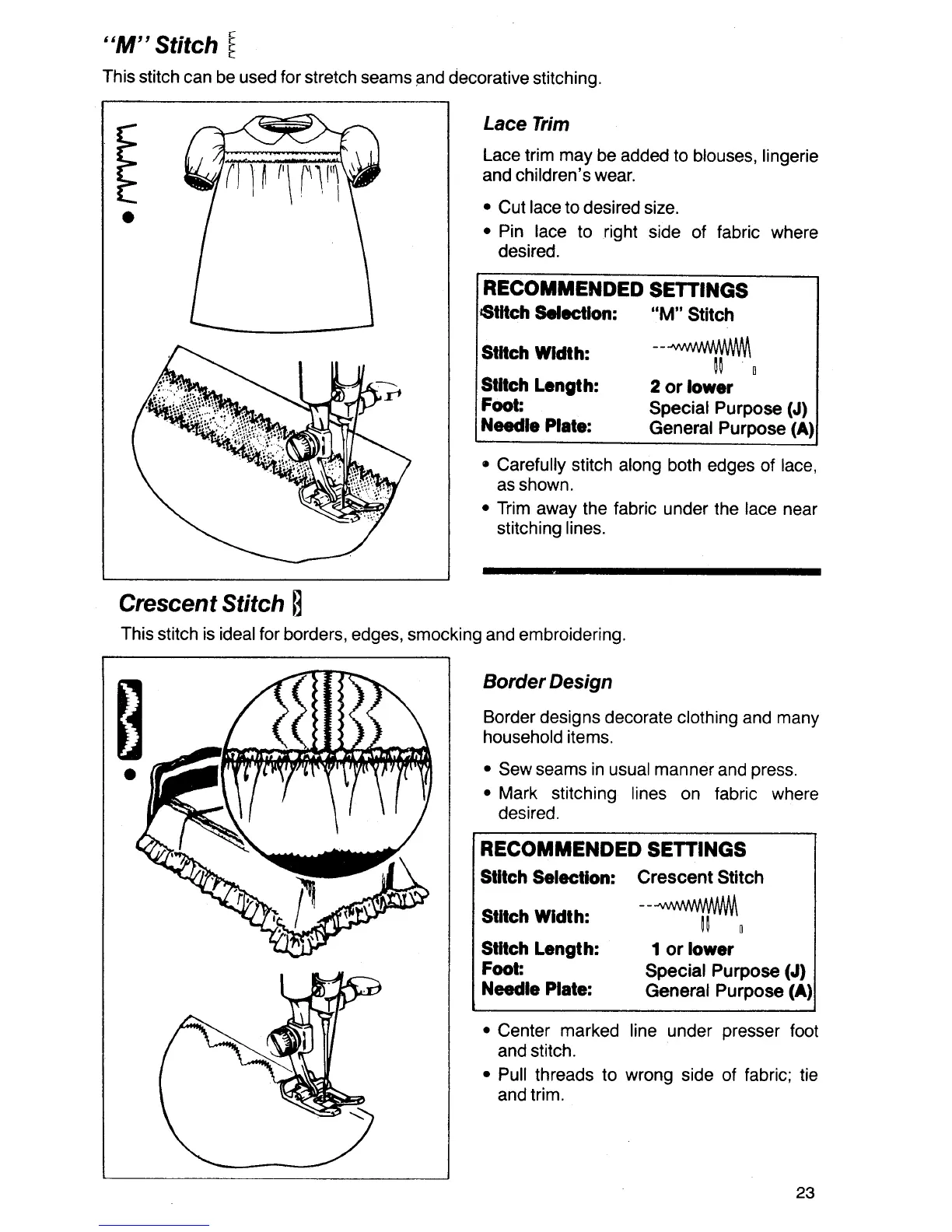 Singer 7004 - M Stitch; Lace Trim; Crescent Stitch; Border Design