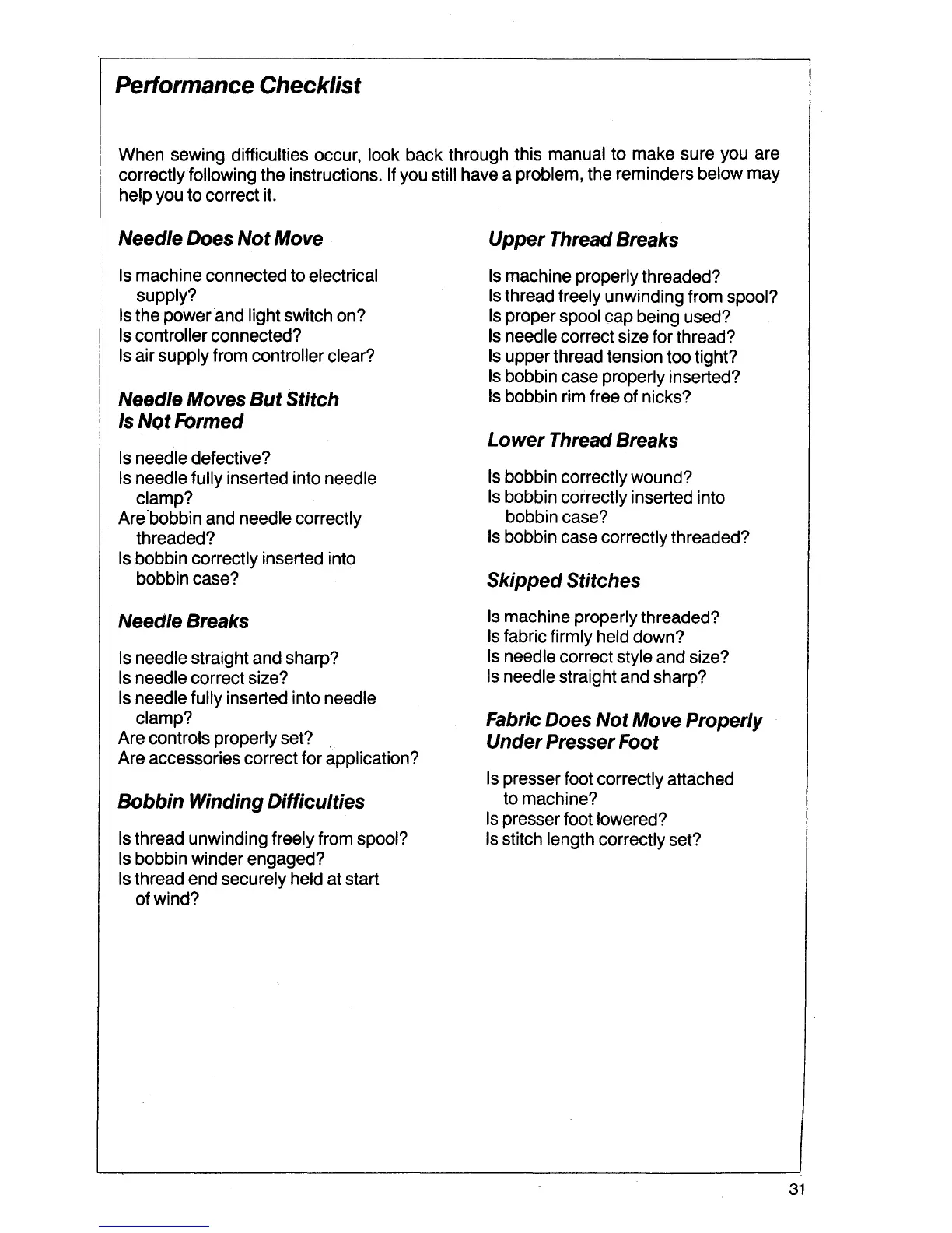 Singer 7004 - Performance Checklist; Needle Does Not Move; Needle Moves but Stitch Is Not Formed; Upper Thread Breaks