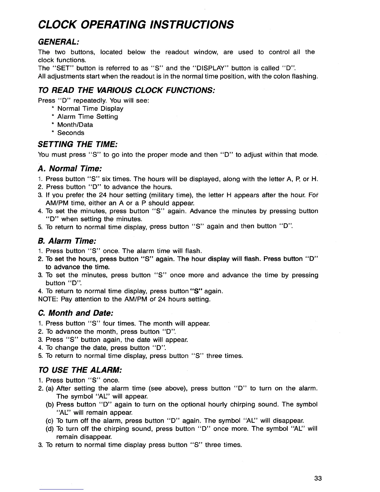 Singer 7004 - Clock Operating Instructions; To Read the Various Clock Functions; Setting the Time; Normal Time