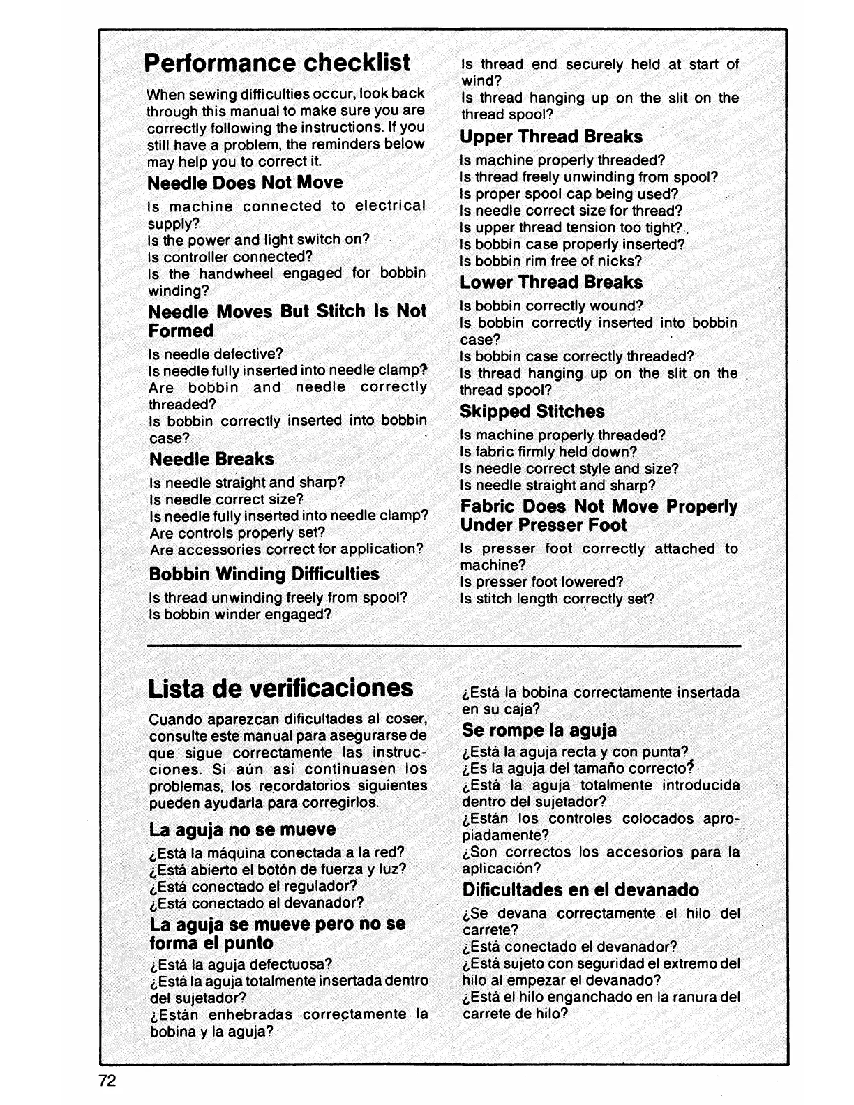 Singer 7011 - Performance Checklist; Needle Does Not Move; Needle Moves But Stitch Not Formed; Needle Breaks