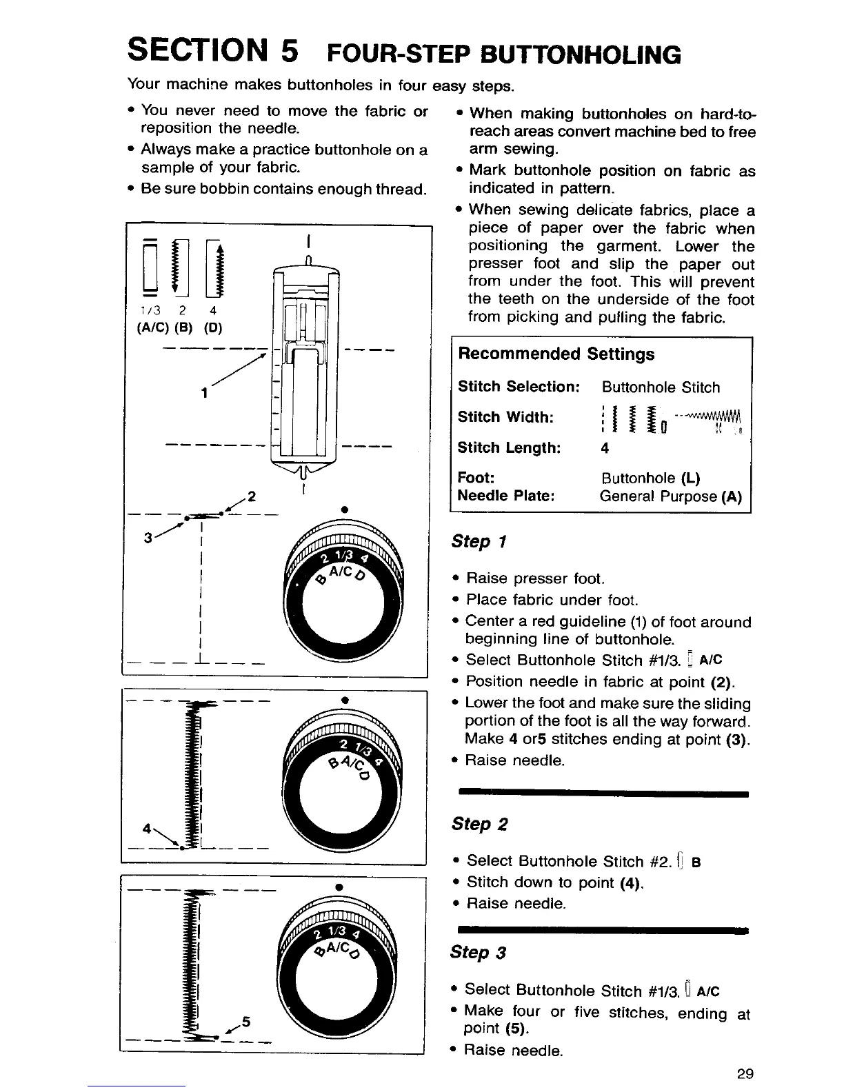 Singer 7033 - SECTION 5 FOUR-STEP BUTTONHOLING; Step 1: Prepare Buttonhole; Step 2: Stitch First Side; Step 3: Stitch Second Side