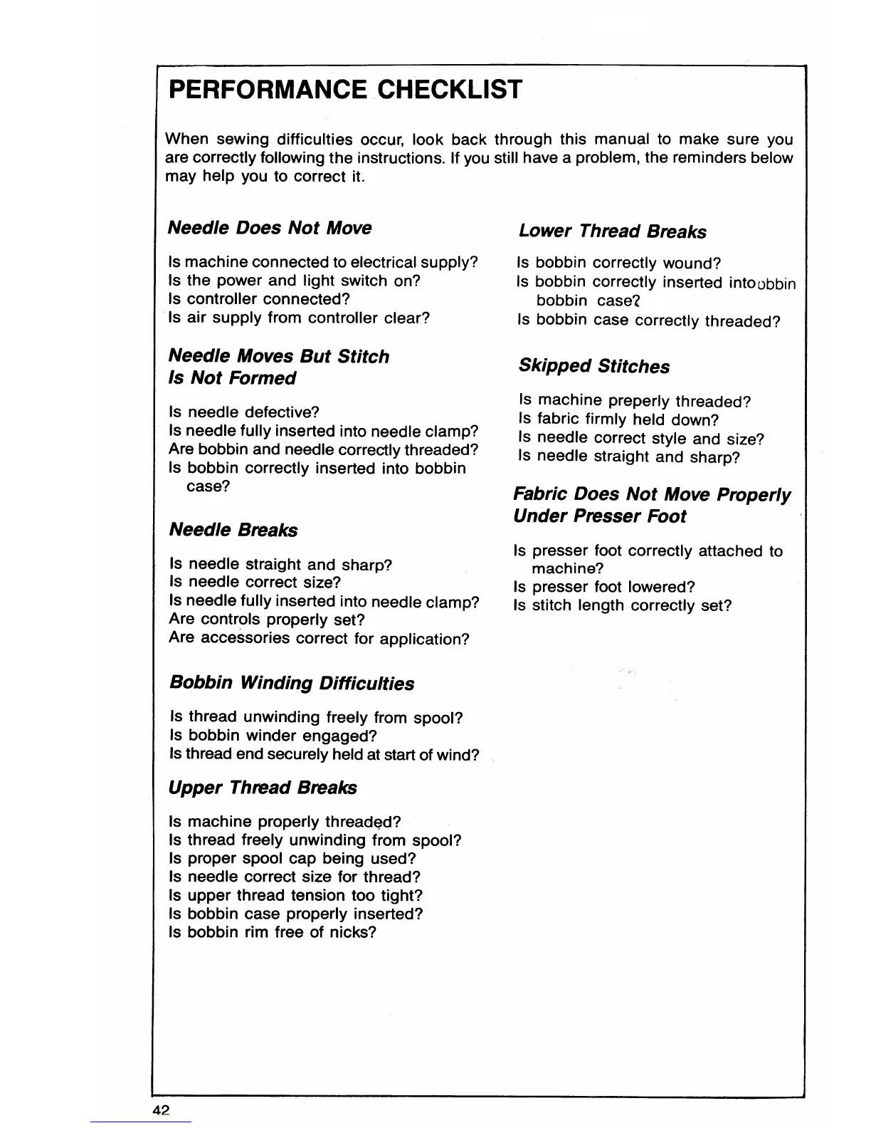 Singer 7057 - PERFORMANCE CHECKLIST