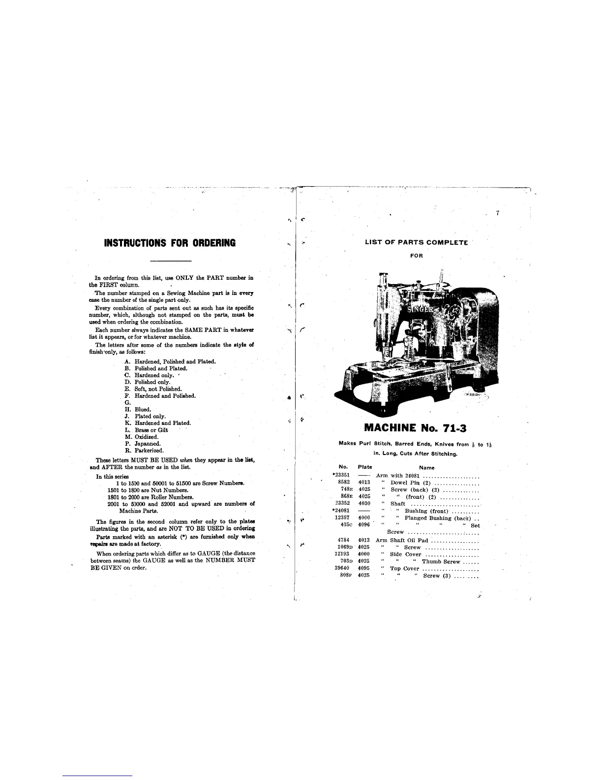 Singer 71-3 - INSTRUCTIONS FOR ORDERING; MACHINE No. 71-3 PARTS LIST