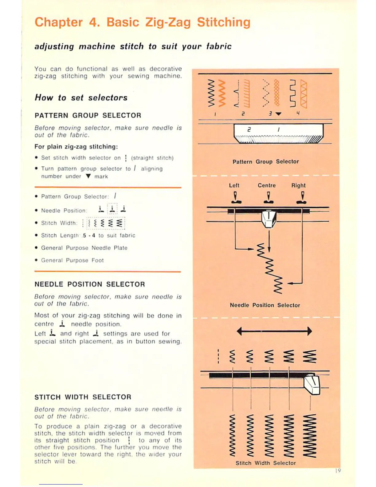 Singer 7110 - Adjusting Stitch for Fabric Type; Setting Zig-Zag Selectors; Pattern Group Selector Usage