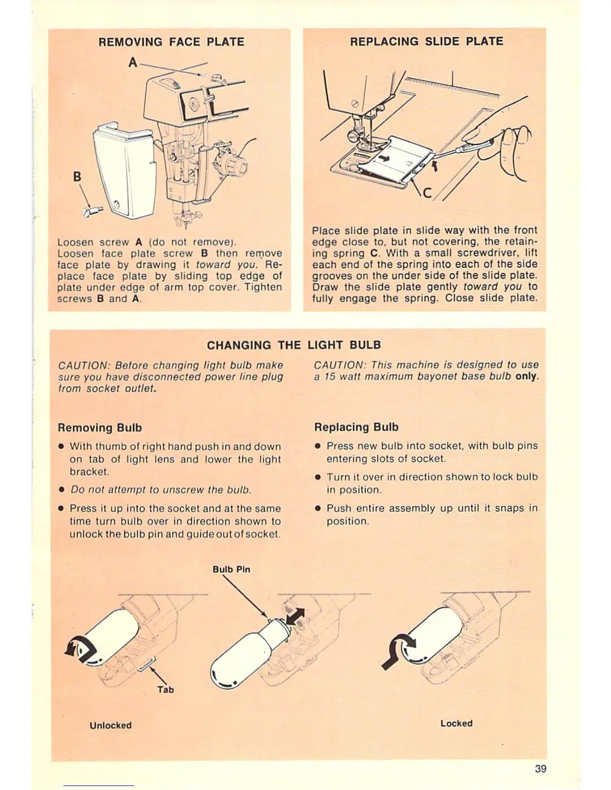 Singer 7110 - Removing Face Plate, Replacing Slide Plate; Changing the Light Bulb