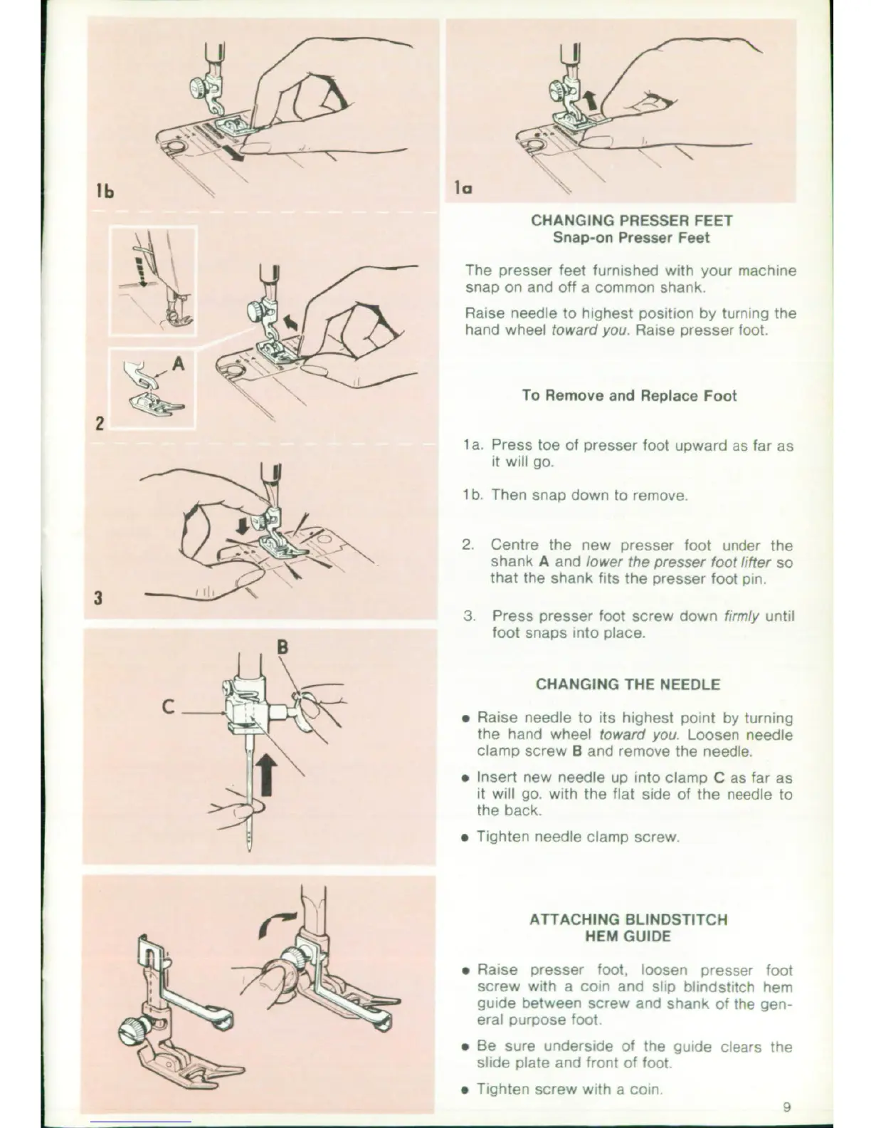 Singer 7146; 7186 - Changing Presser Feet; Changing the Needle; Attaching Blindstitch Hem Guide; Snap-On Presser Feet;To Remove and Replace Foot