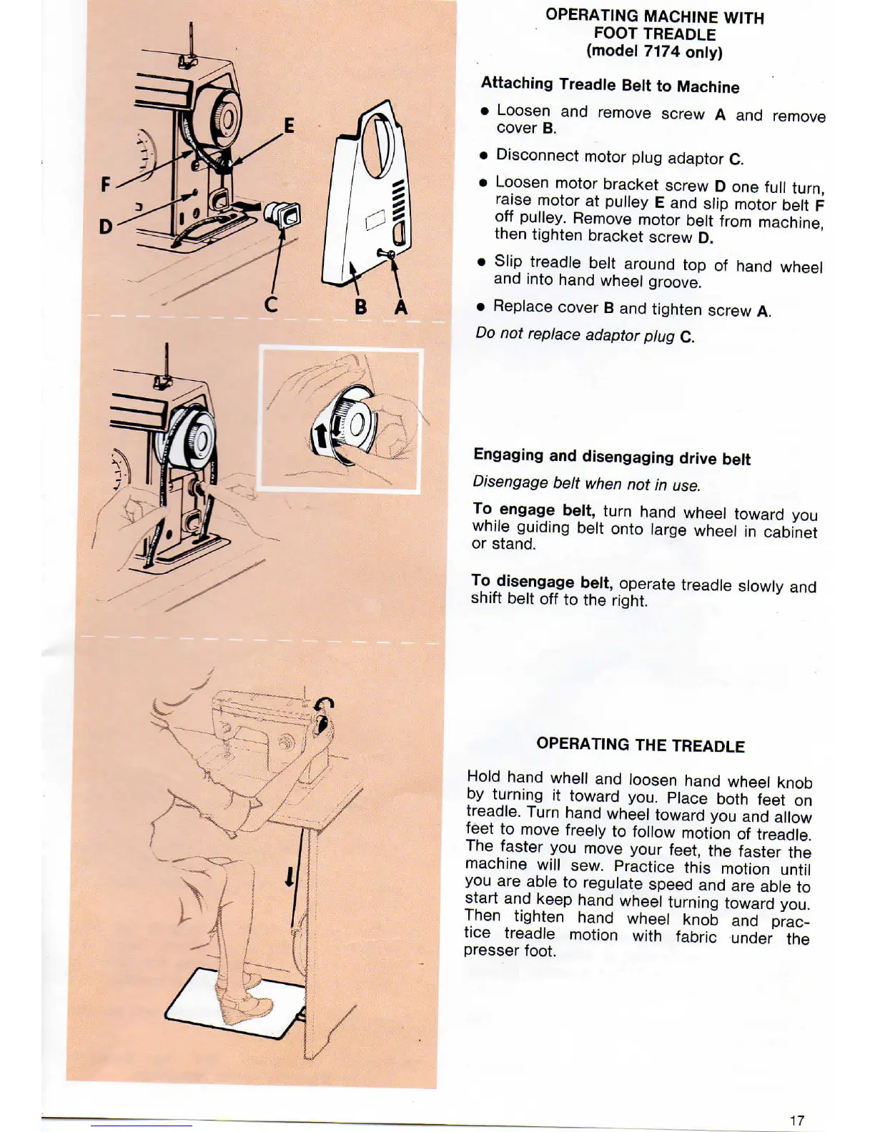 Singer 7174; 7184 - Operating Machine with Foot Treadle (Model 7174 Only); Attaching Treadle Belt to Machine; Engaging and Disengaging Drive Belt; Operating the Treadle