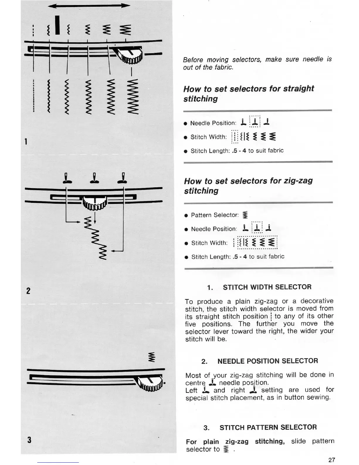 Singer 7174; 7184 - How to Set Selectors for Straight Stitching; How to Set Selectors for Zig-Zag Stitching; Stitch Width Selector; Needle Position Selector