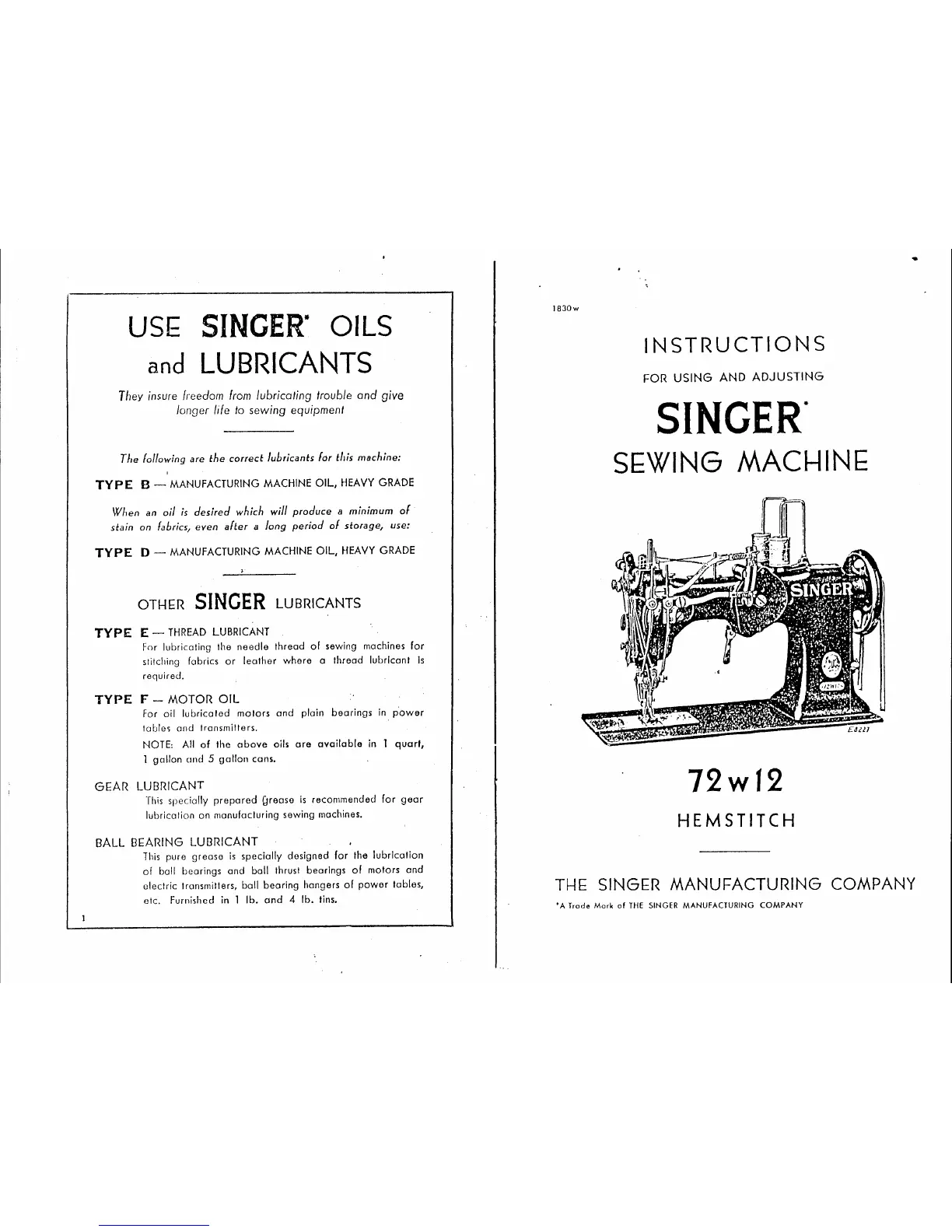 Singer 72W12 - SINGER OILS AND LUBRICANTS; Machine Oils (Type B & D); Other Lubricants (Type E, F, Gear, Ball Bearing); SEWING MACHINE OPERATING INSTRUCTIONS