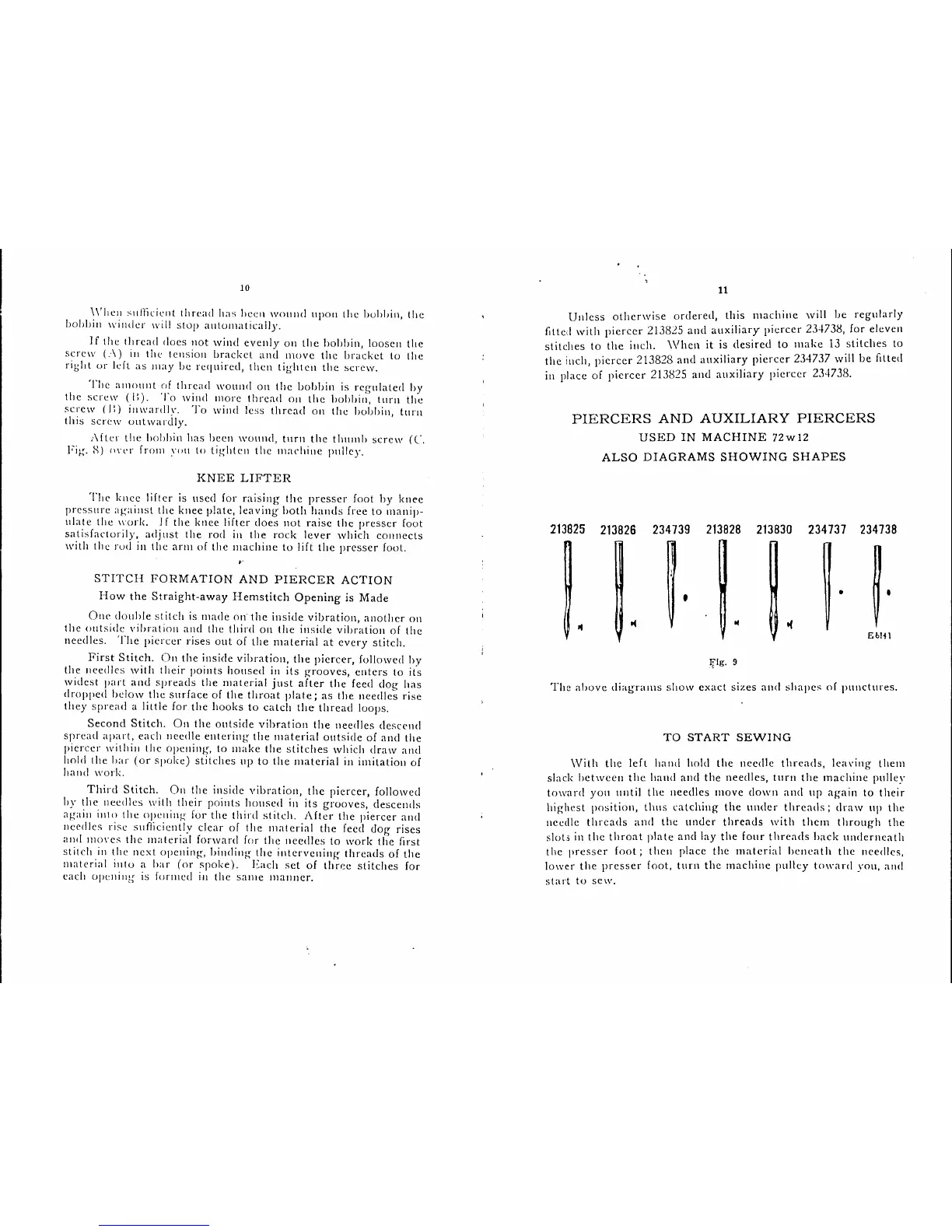Singer 72W12 - OPERATIONAL GUIDANCE AND STITCH FORMATION; Knee Lifter Operation; Hemstitch Opening Formation; Piercer Types and Usage