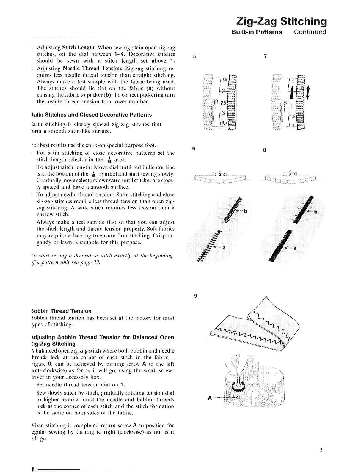 Singer 740 - Satin Stitches and Closed Decorative Patterns; Bobbin Thread Tension; Adjusting Bobbin Thread Tension for Balanced Open Zig-Zag Stitching