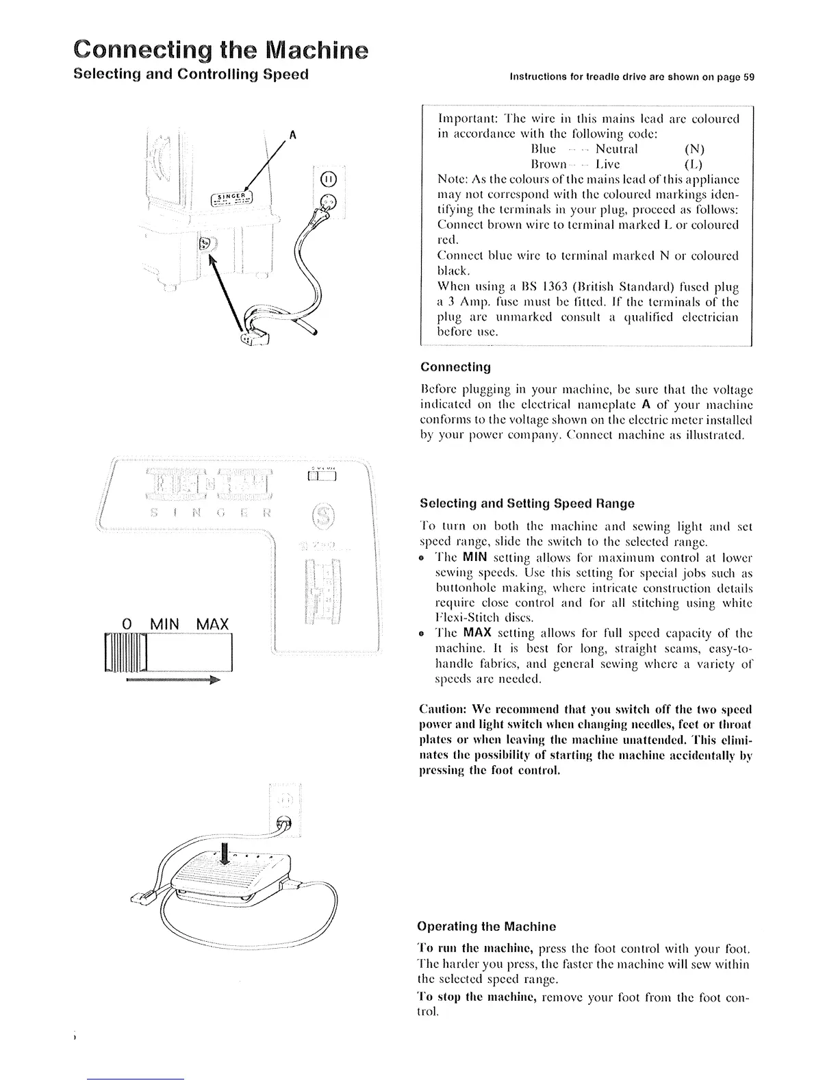 Singer 740 - Connecting the Machine; Selecting and Controlling Speed; Operating the Machine
