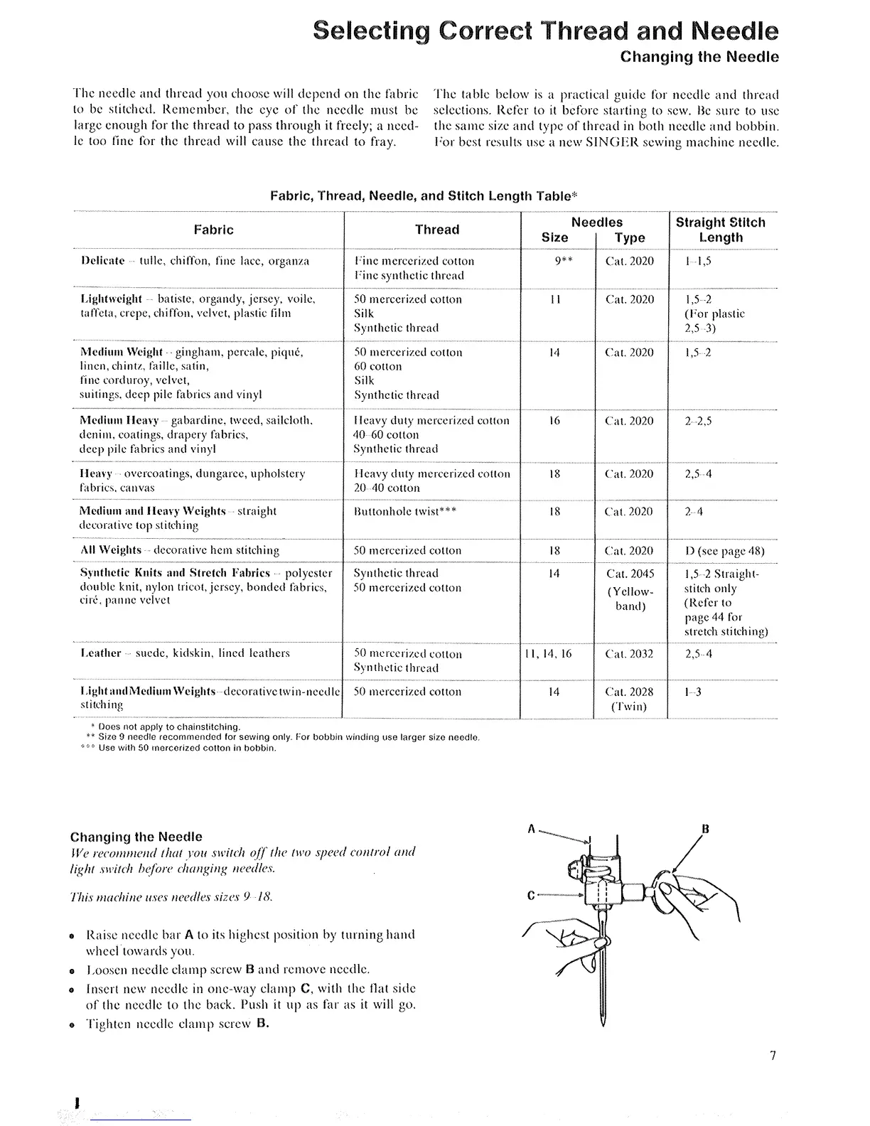 Singer 760 - Selecting Correct Thread and Needle; Changing the Needle; Fabric, Thread, Needle, and Stitch Length Table