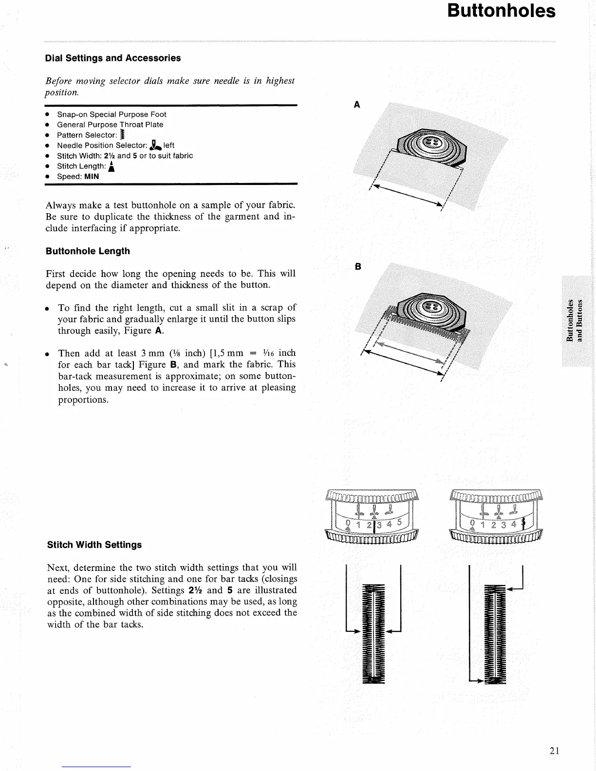 Singer 764 - Buttonholes; Buttonhole Setup and Length; Stitch Width Settings for Buttonholes
