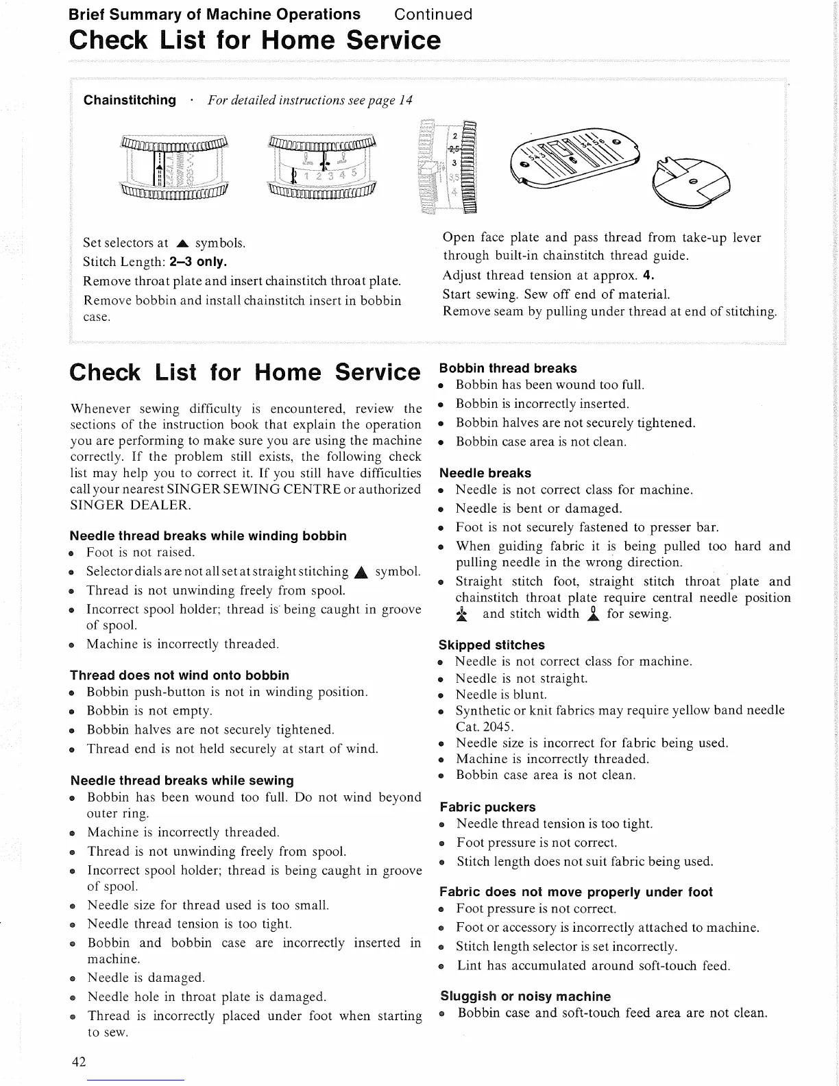 Singer 764 - Check List for Home Service; Troubleshooting Needle and Bobbin Issues; Troubleshooting Fabric Feed and Machine Issues