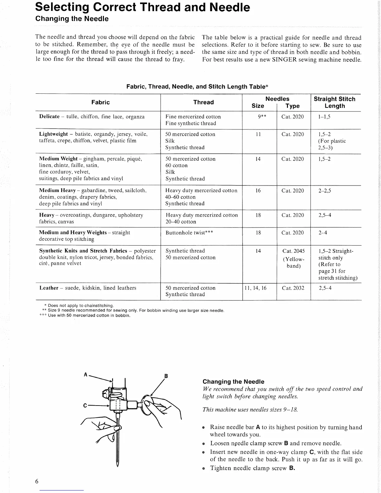 Singer 764 - Selecting Correct Thread and Needle; Fabric, Thread, Needle, and Stitch Length Table; Changing the Needle