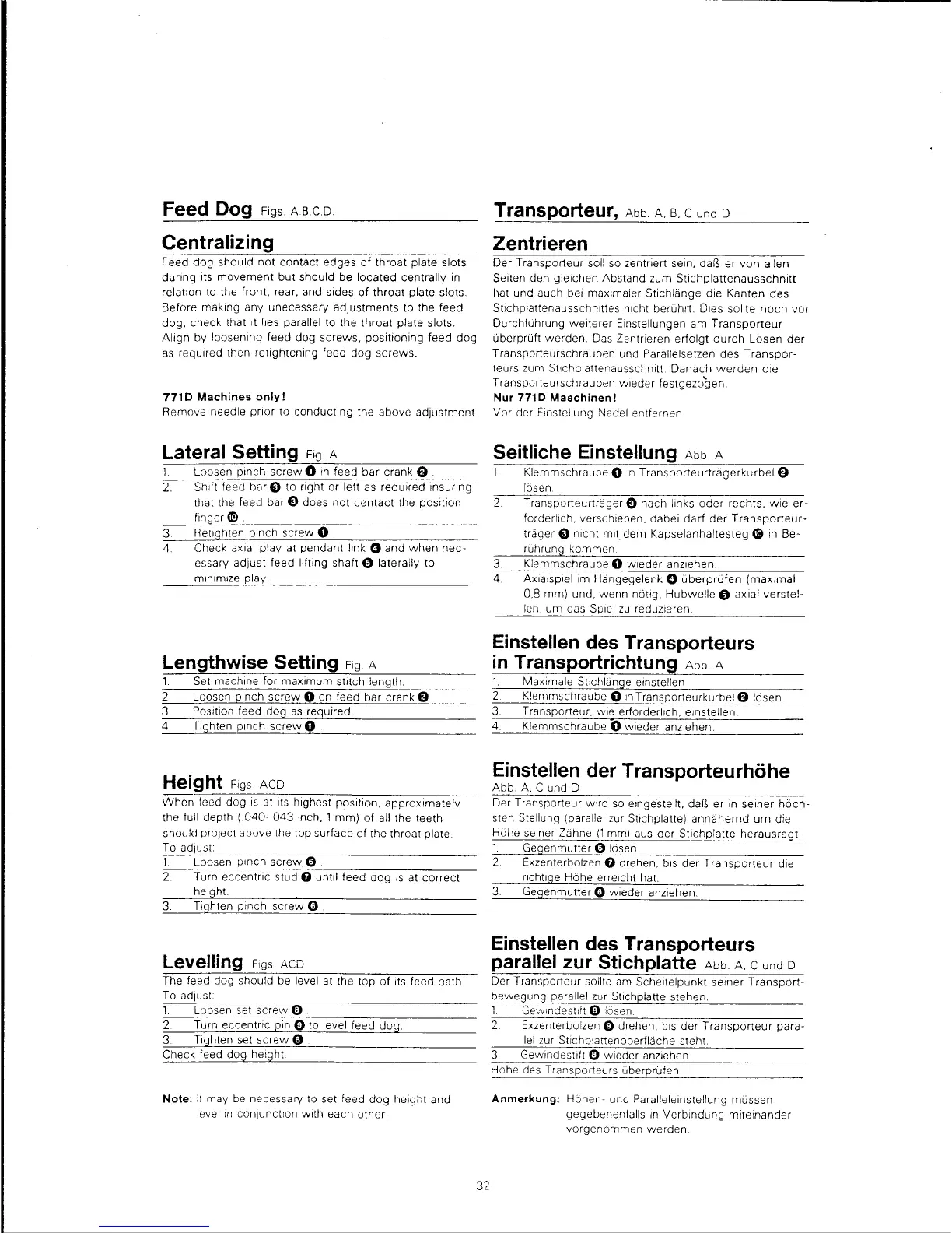 Singer 770D1 - Feed Dog Centralizing; Lateral Setting; Lengthwise Setting; Levelling