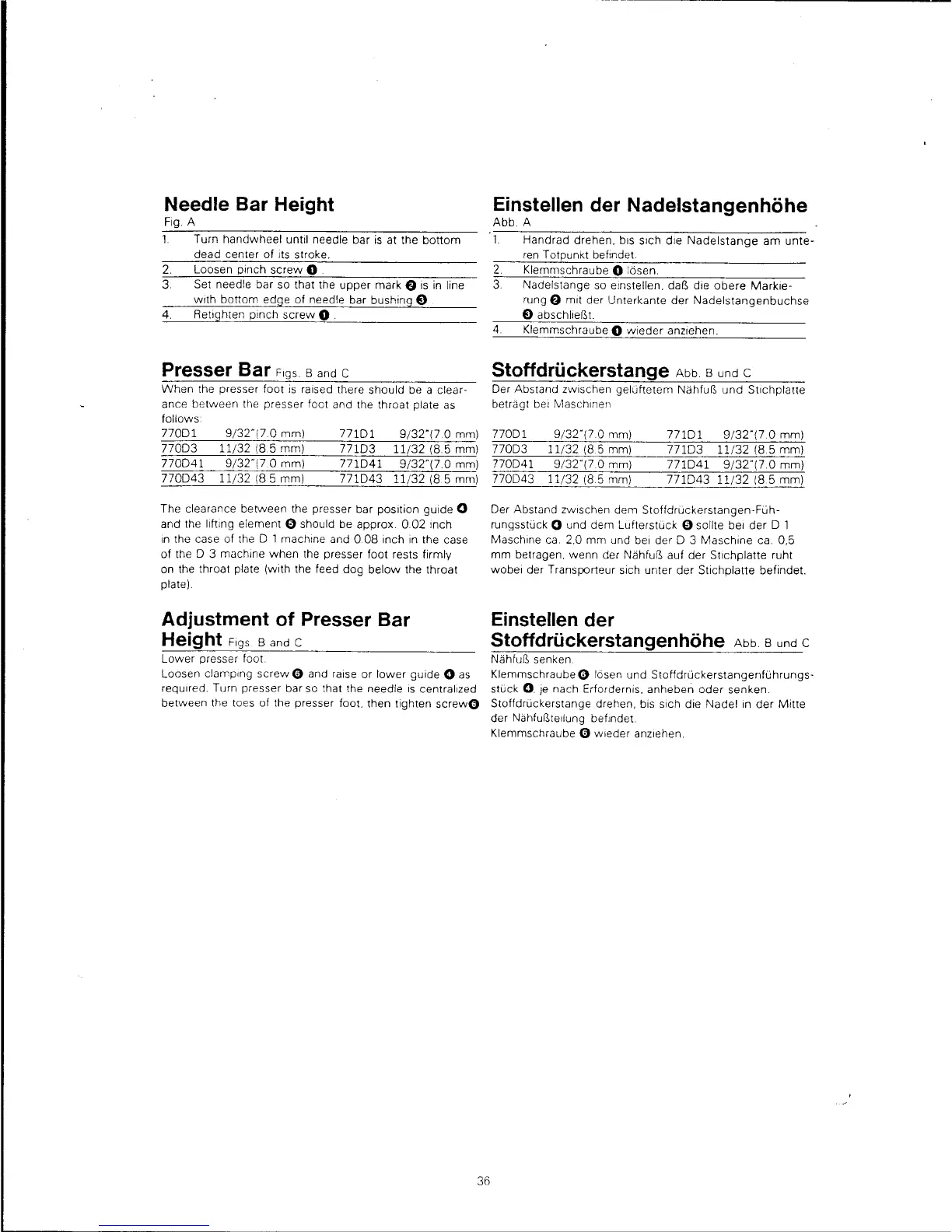 Singer 770D1 - Heedle Bar Height; Presser Bar; Adjustment of Presser Bar Height