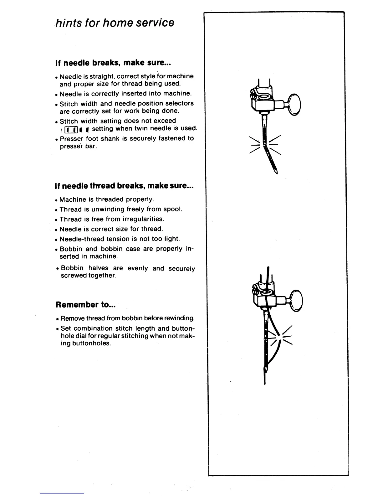 Singer 8007 - Hints for Home Service; If Needle Breaks, Make Sure...; If Needle Thread Breaks, Make Sure...; Remember to...