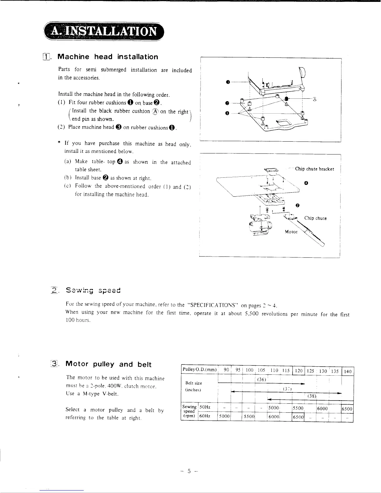 Singer 831U - A. Installation; Machine Head Installation; Sewing Speed; Motor Pulley and Belt