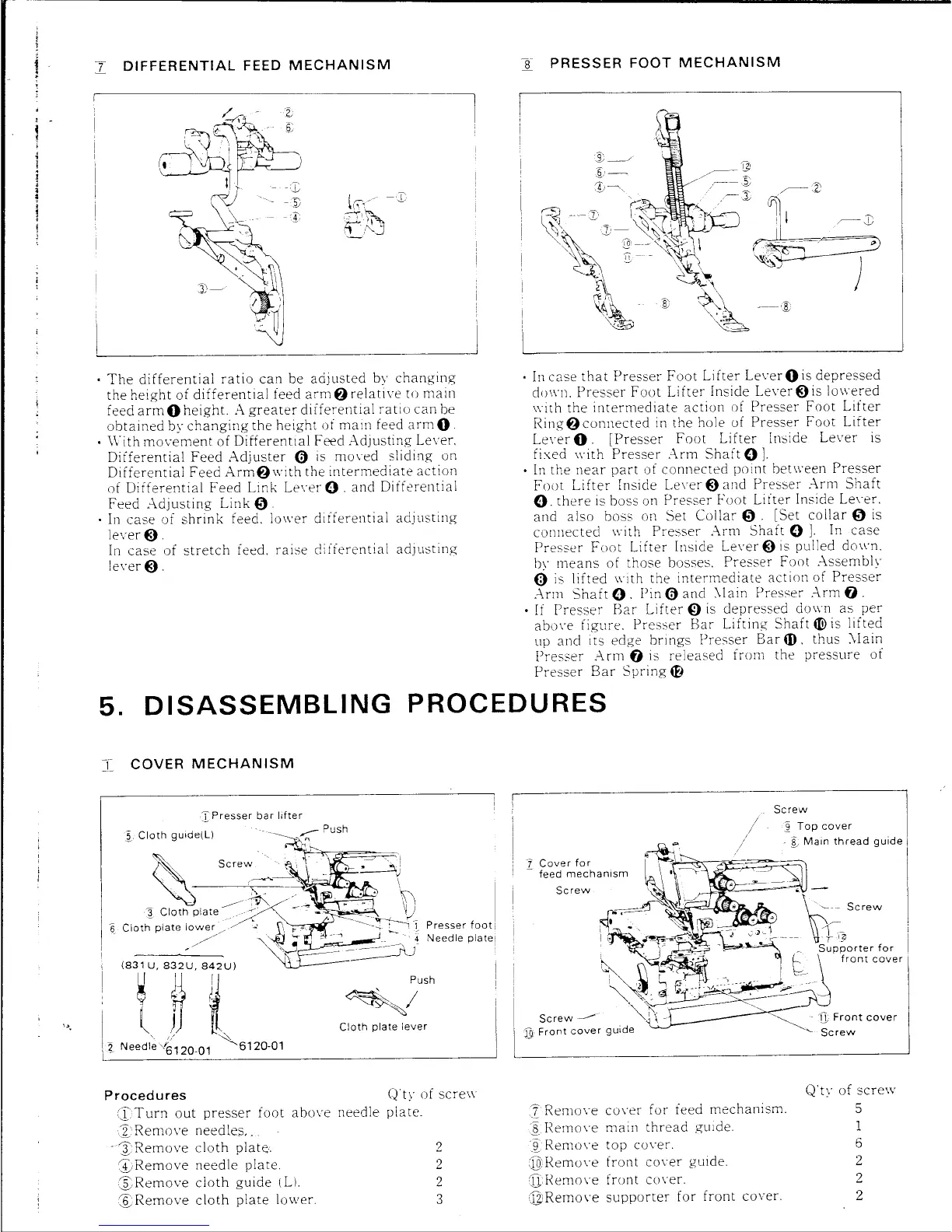 Singer 832U - DIFFERENTIAL FEED MECHANISM; PRESSER FOOT MECHANISM; DISASSEMBLING PROCEDURES; COVER MECHANISM