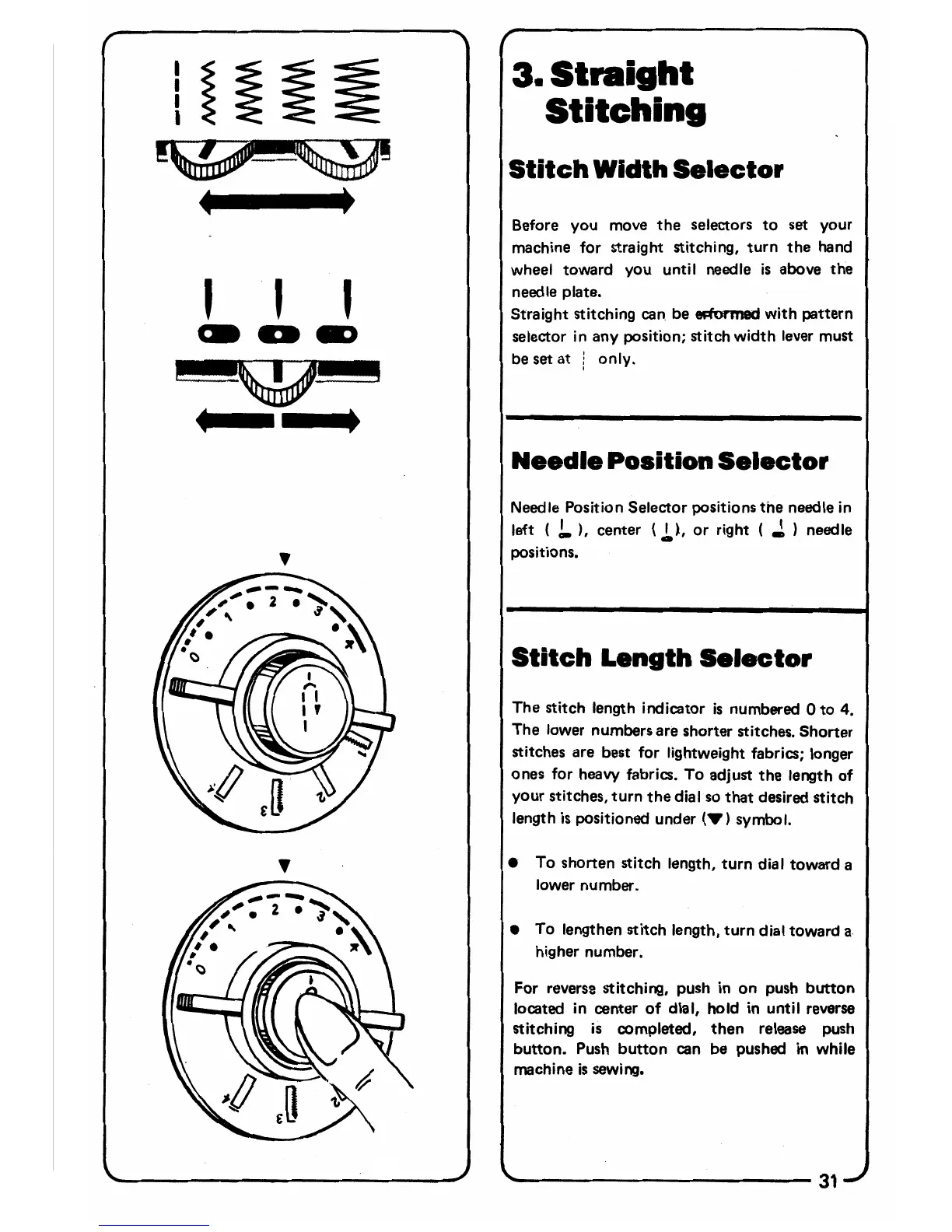 Singer 875 - Straight Stitching; Stitch Width Selector; Needle Position Selector; Stitch Length Selector