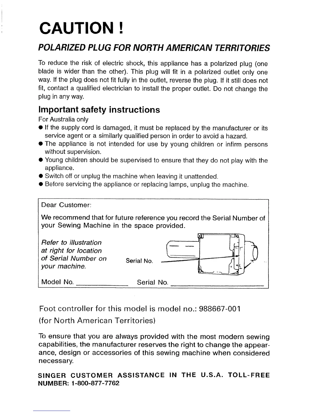SINGER CUSTOMER ASSISTANCE IN THE U.S.A. TOLL-FREE