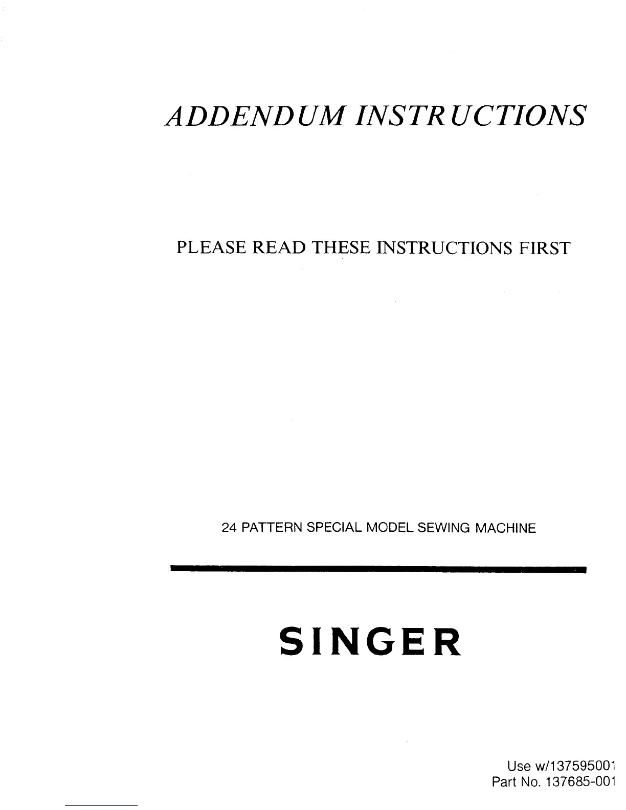 Singer 93234 - ADDENDUM INSTRUCTIONS; 24 PATTERN SPECIAL MODEL SEWING MACHINE