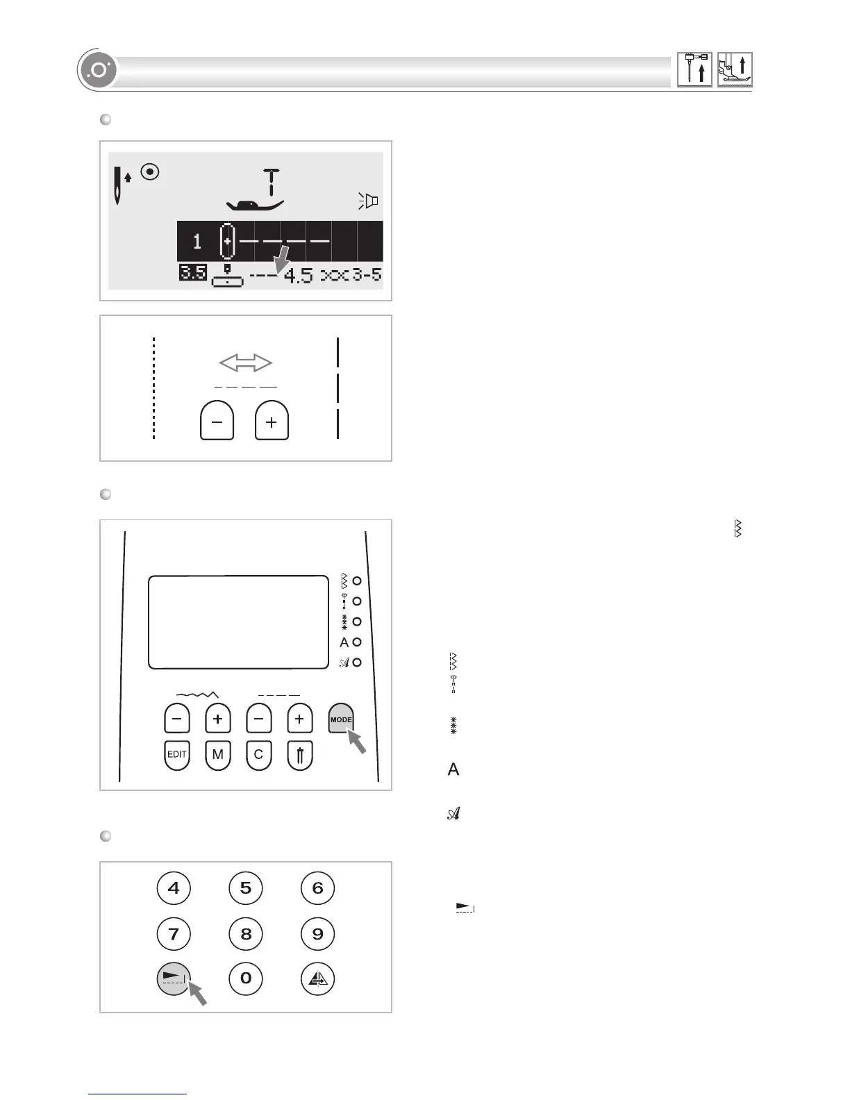 button (left). For a longer stitch length, press