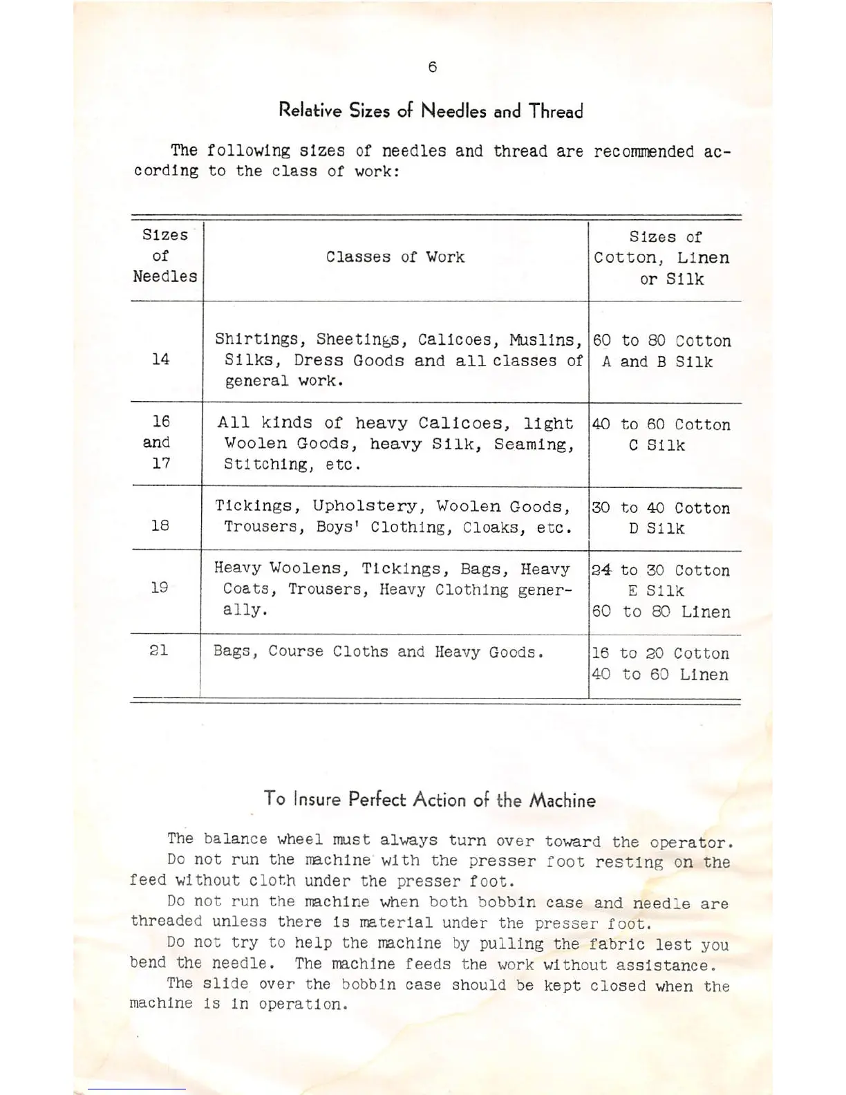 Singer 95-80 - Needle and Thread Size Guide; Recommended Needle and Thread Sizes by Work Class; Tips for Optimal Machine Operation