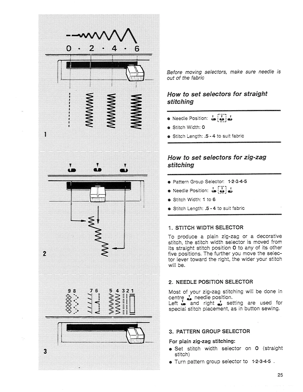 Singer 9606 - Stitch Width Selector; Needle Position Selector; Pattern Group Selector; How to Set Selectors for Straight;Zig-Zag Stitching