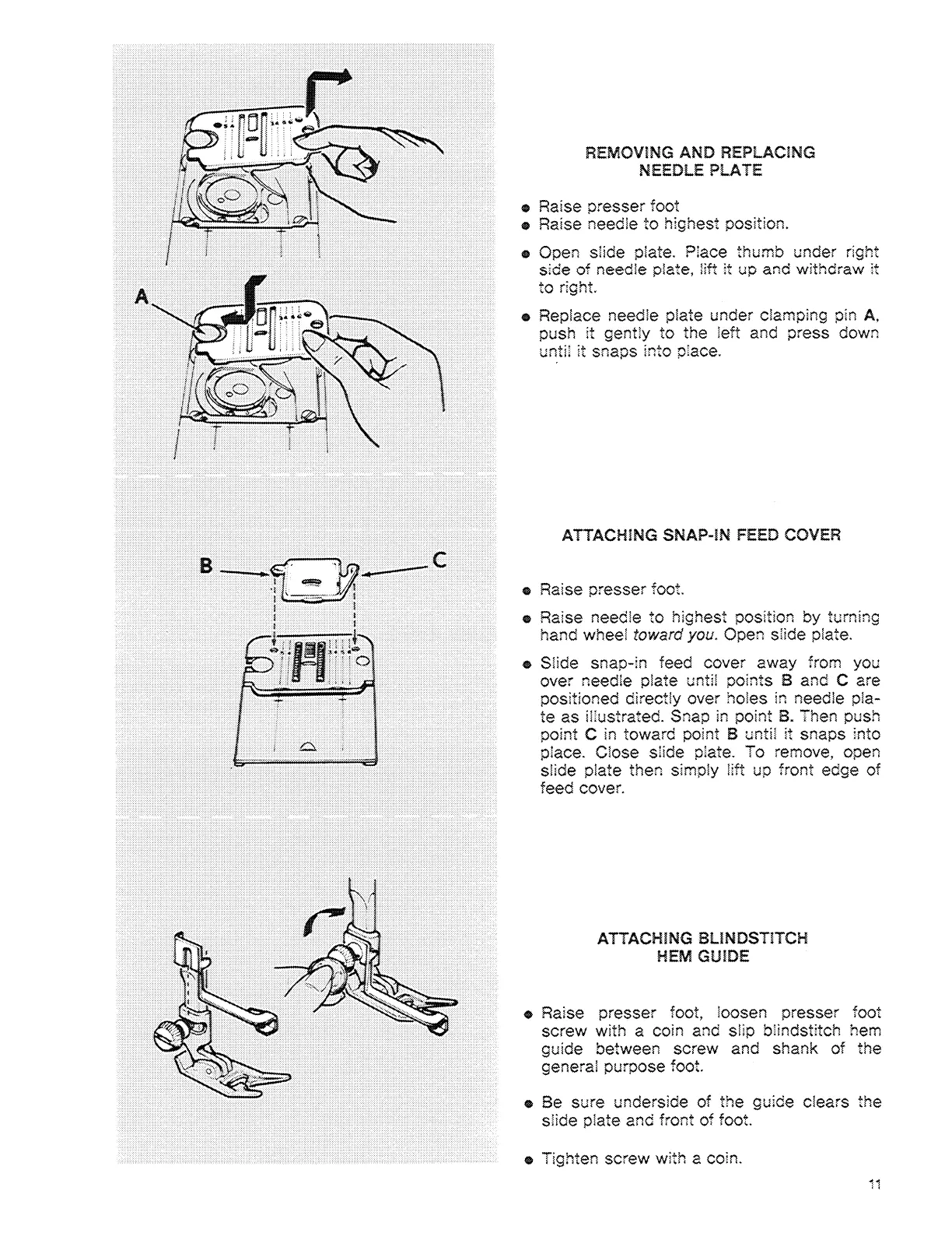 Singer 9608 - Removing and Replacing Needle Plate; Attaching Snap-In Feed Cover; Attaching Blindstitch Hem Guide