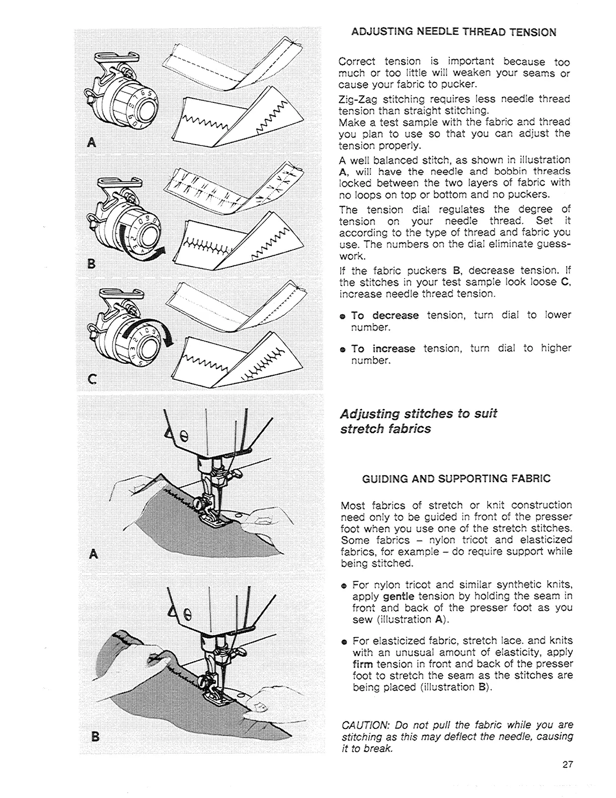 Singer 9608 - Adjusting Needle Thread Tension; Guiding and Supporting Fabric; Adjusting Stitches to Suit Stretch Fabrics
