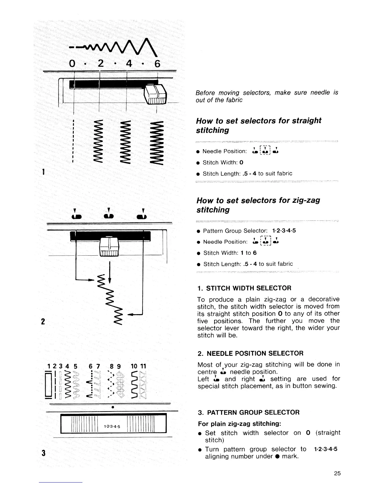 Singer 9610 - Stitch Width Selector; Needle Position Selector; Pattern Group Selector