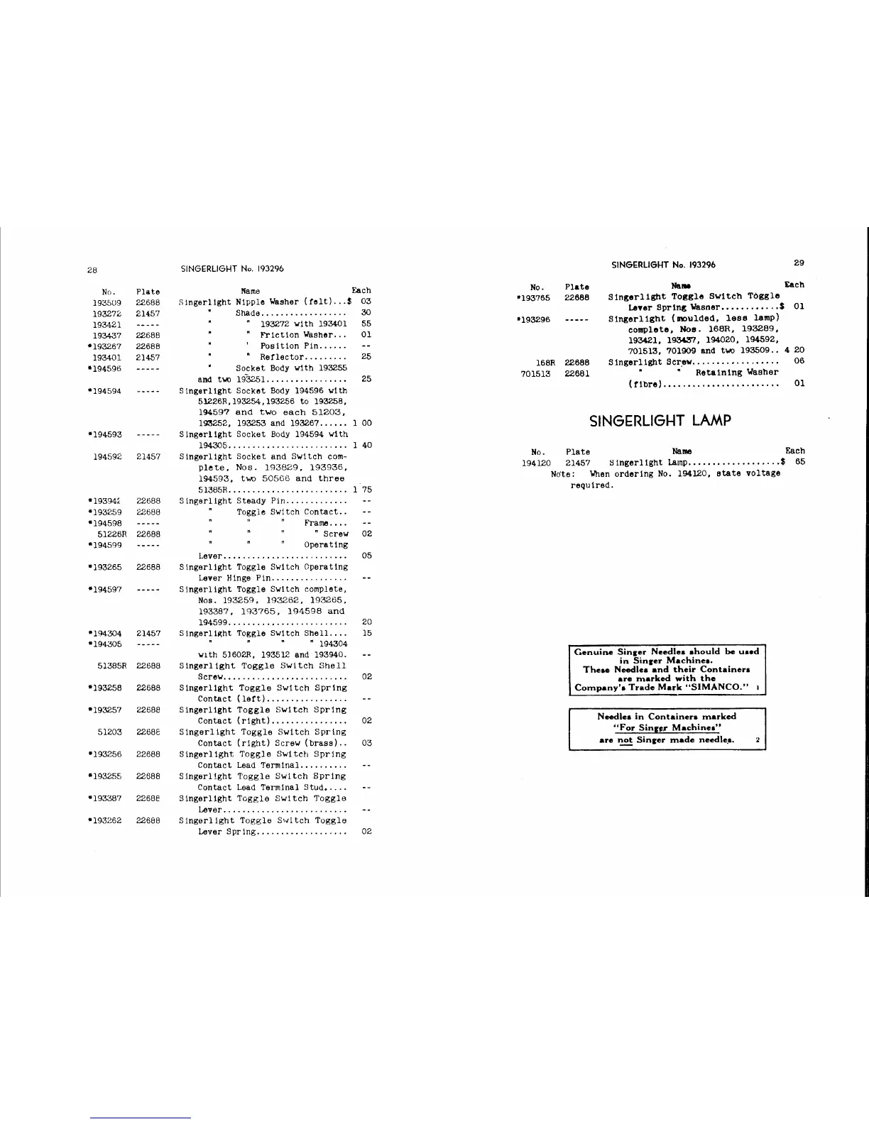 Singer 99-13 - Singerlight No. 193296; Lamp and Components