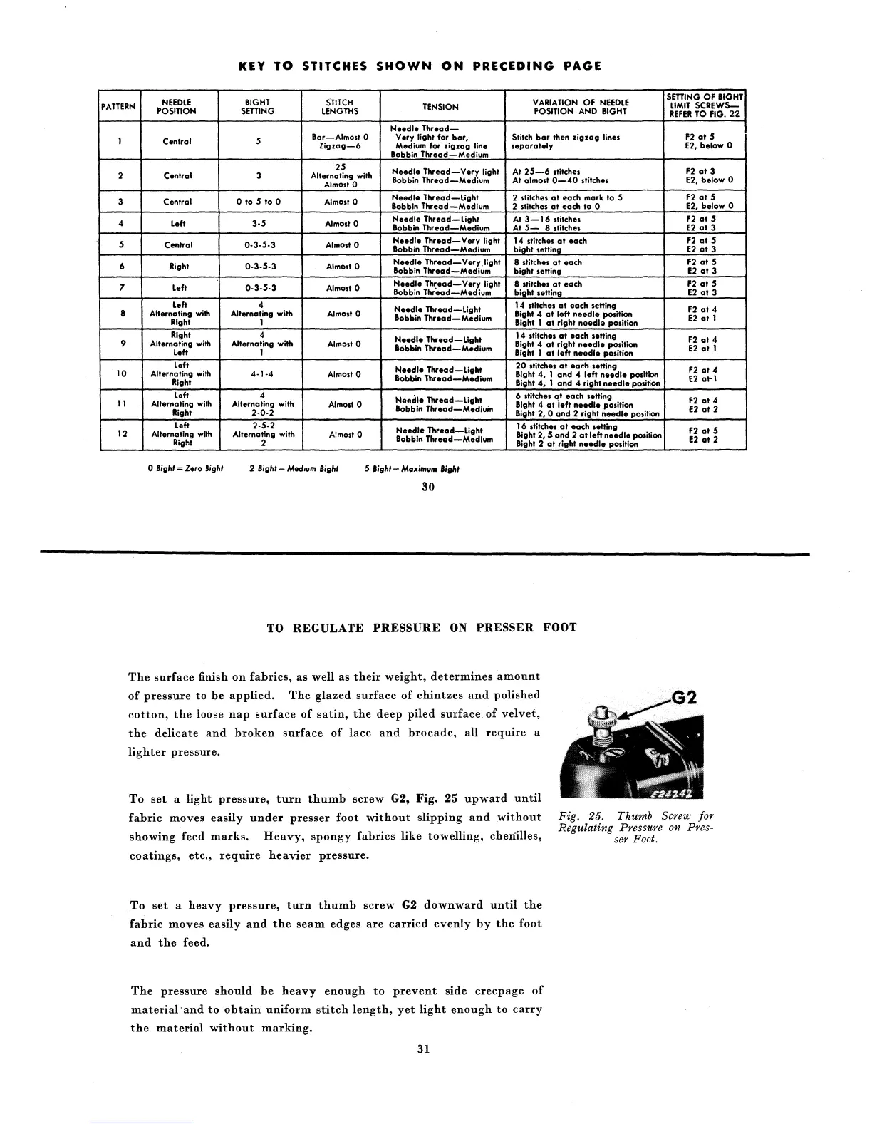 Singer Automatic 306K - Stitch Key and Presser Foot Pressure; Key to Stitch Patterns; Adjusting Presser Foot Pressure