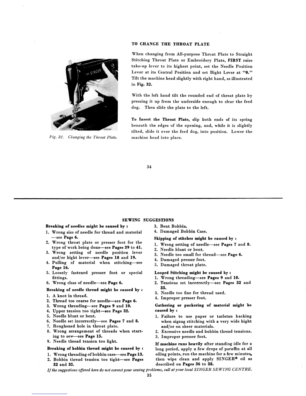 Singer Automatic 306K - Machine Setup and Sewing Tips; Changing the Throat Plate; Troubleshooting Common Sewing Issues