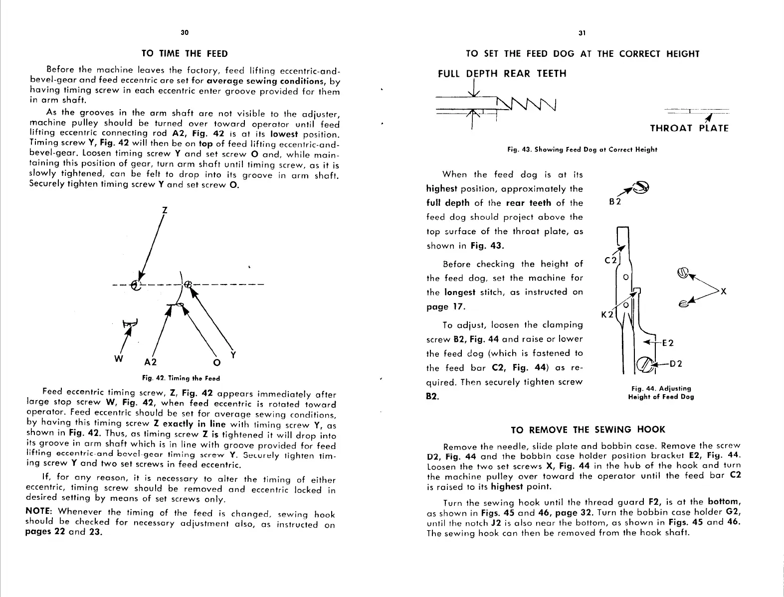 Singer class 251 - Feed Timing and Dog Height Setting; To Time the Feed; To Set the Feed Dog at the Correct Height; Sewing Hook Removal