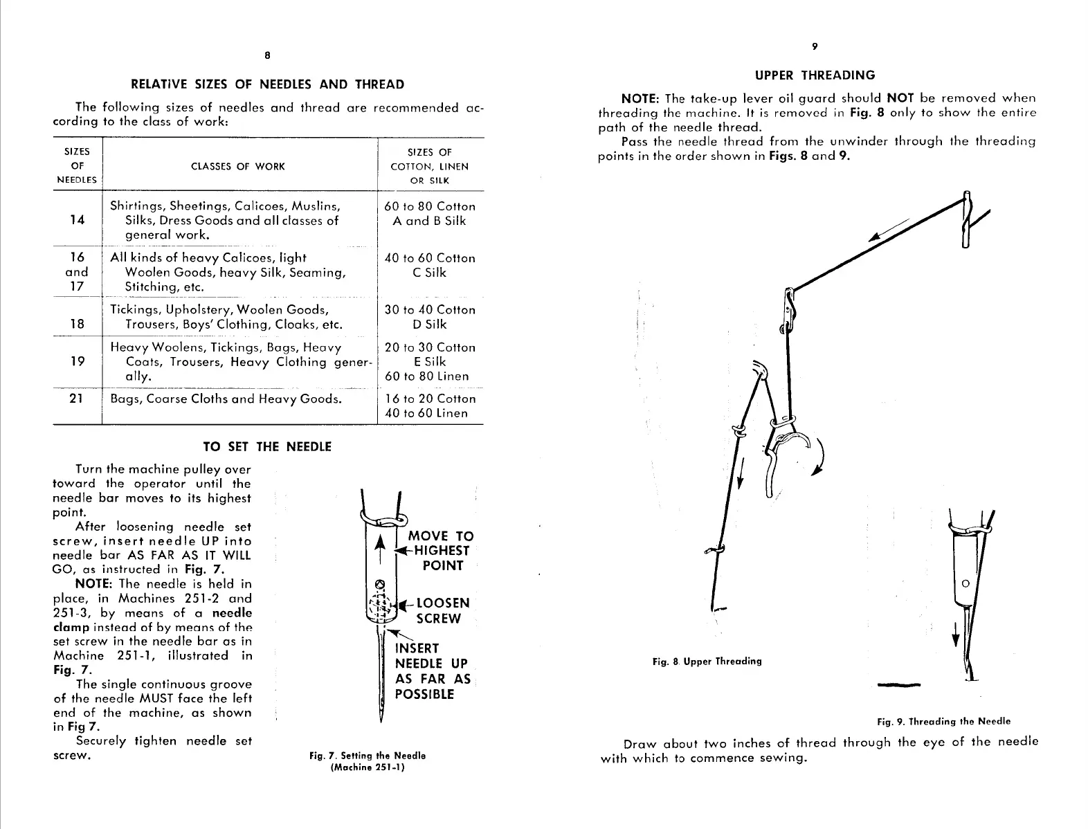 Singer class 251 - Relative Sizes of Needles and Thread; Setting the Needle Correctly