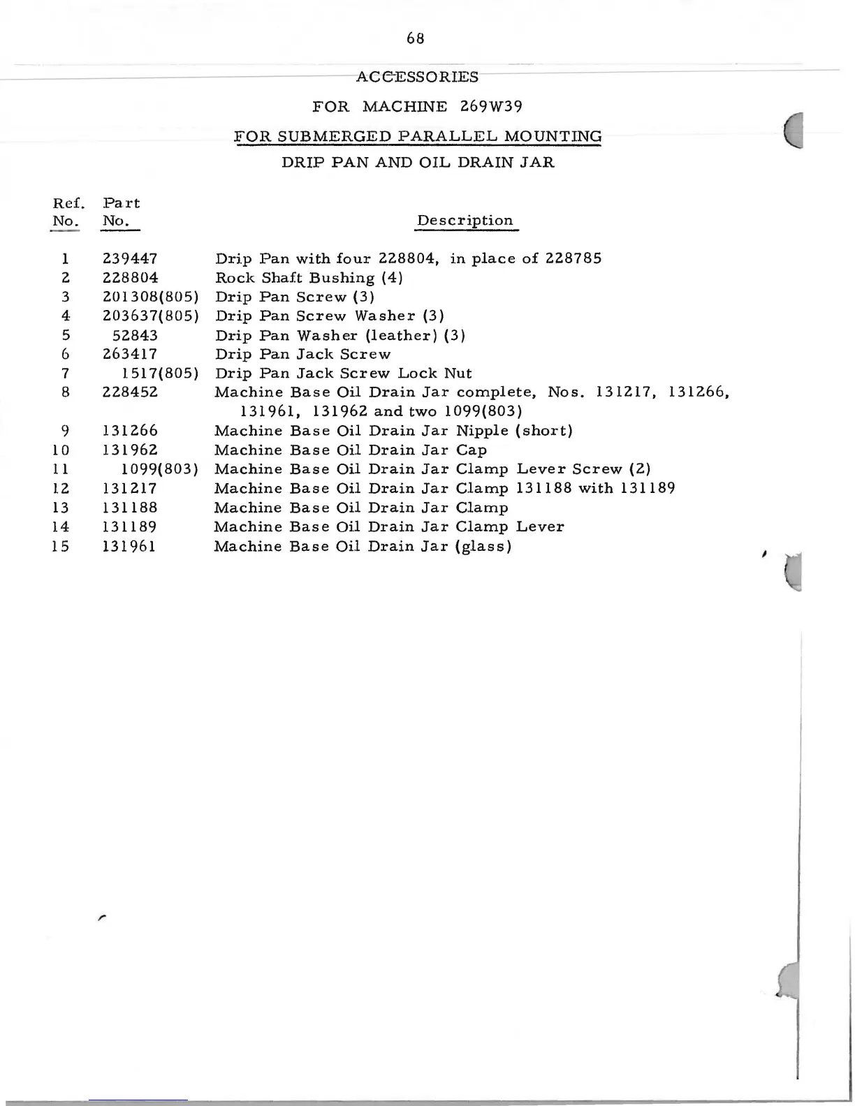 Singer Class 269w - Accessories for Machine 269 w39 for Submerged Parallel Mounting Drip Pan and Oil Drain Jar