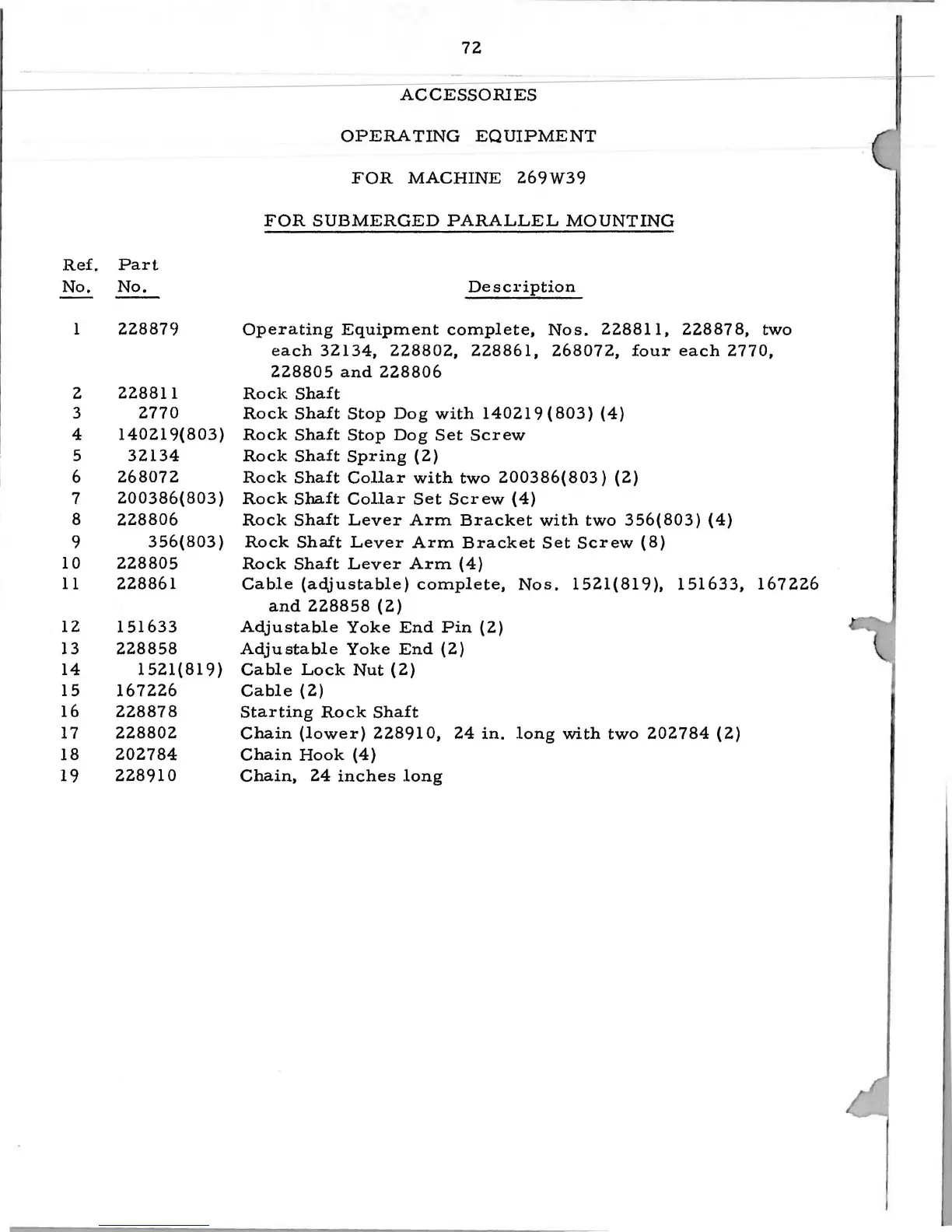 Singer Class 269w - Accessories Operating Equipment for Machine 269 w39 for Submerged Parallel Mounting