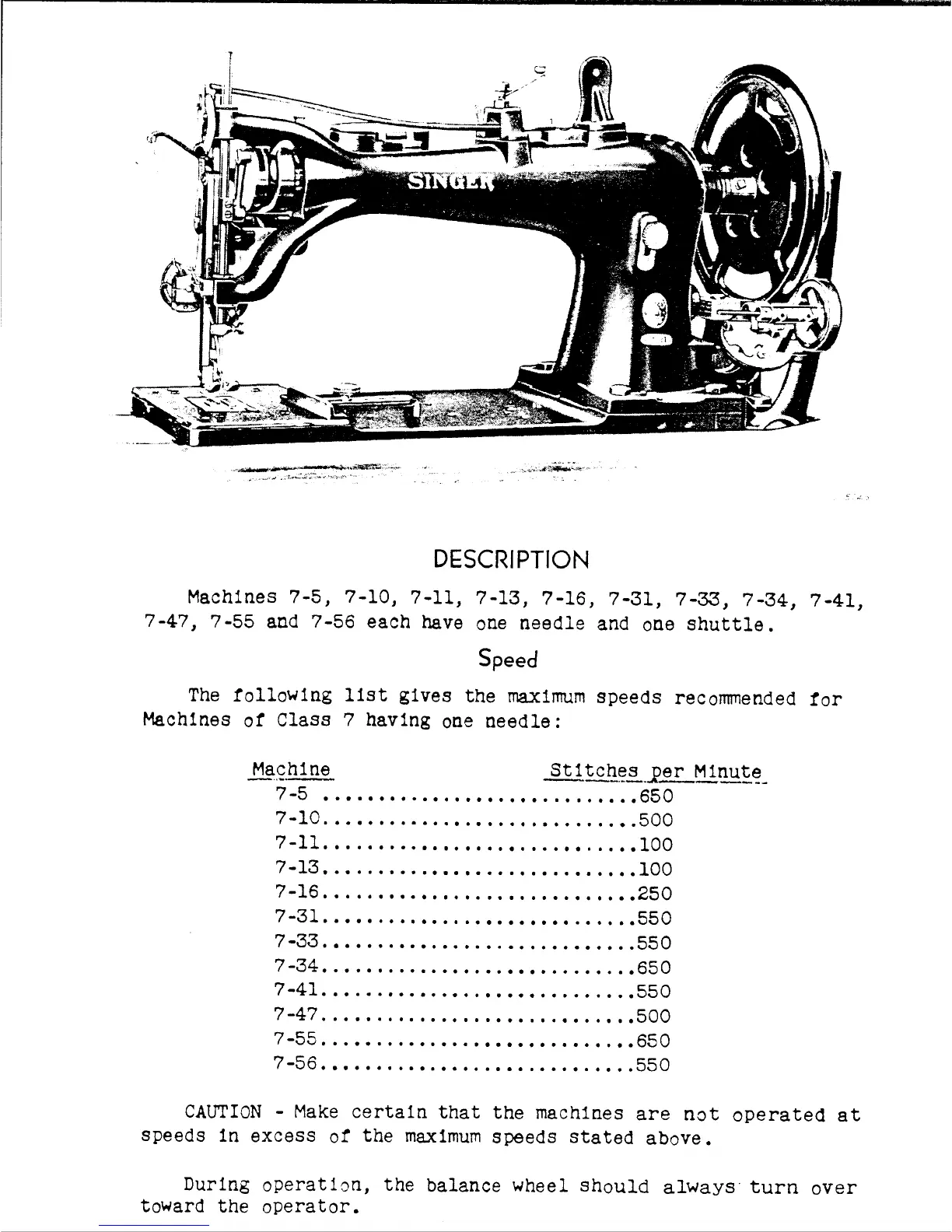 Singer CLASS 7 ONE NEEDLE LOCK STITCH - Machine Description and Speed; Machine Model Descriptions; Recommended Machine Speeds