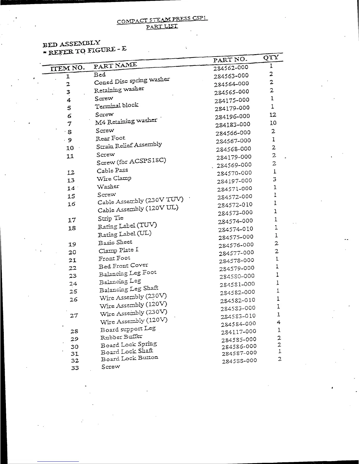 Singer CSP1 - Bed Assembly; Bed Assembly Parts List