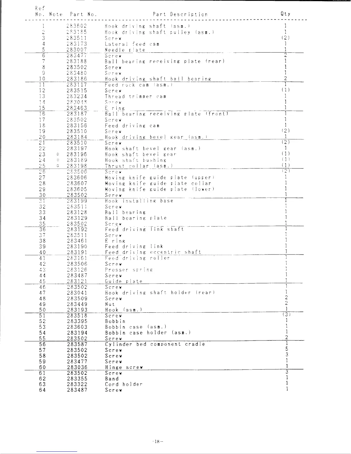 Singer CXL - Hook and Hook Driving Shaft Parts List