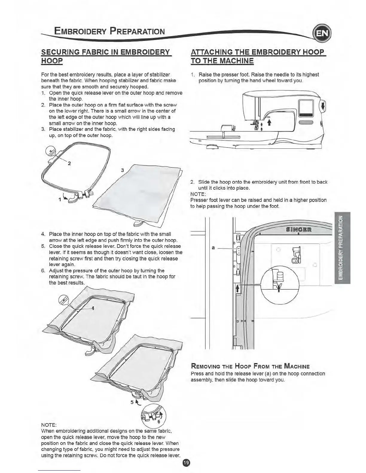 Singer EM200 - Embroidery Preparation; Securing Fabric in Embroidery Hoop; Attaching the Embroidery Hoop to the Machine