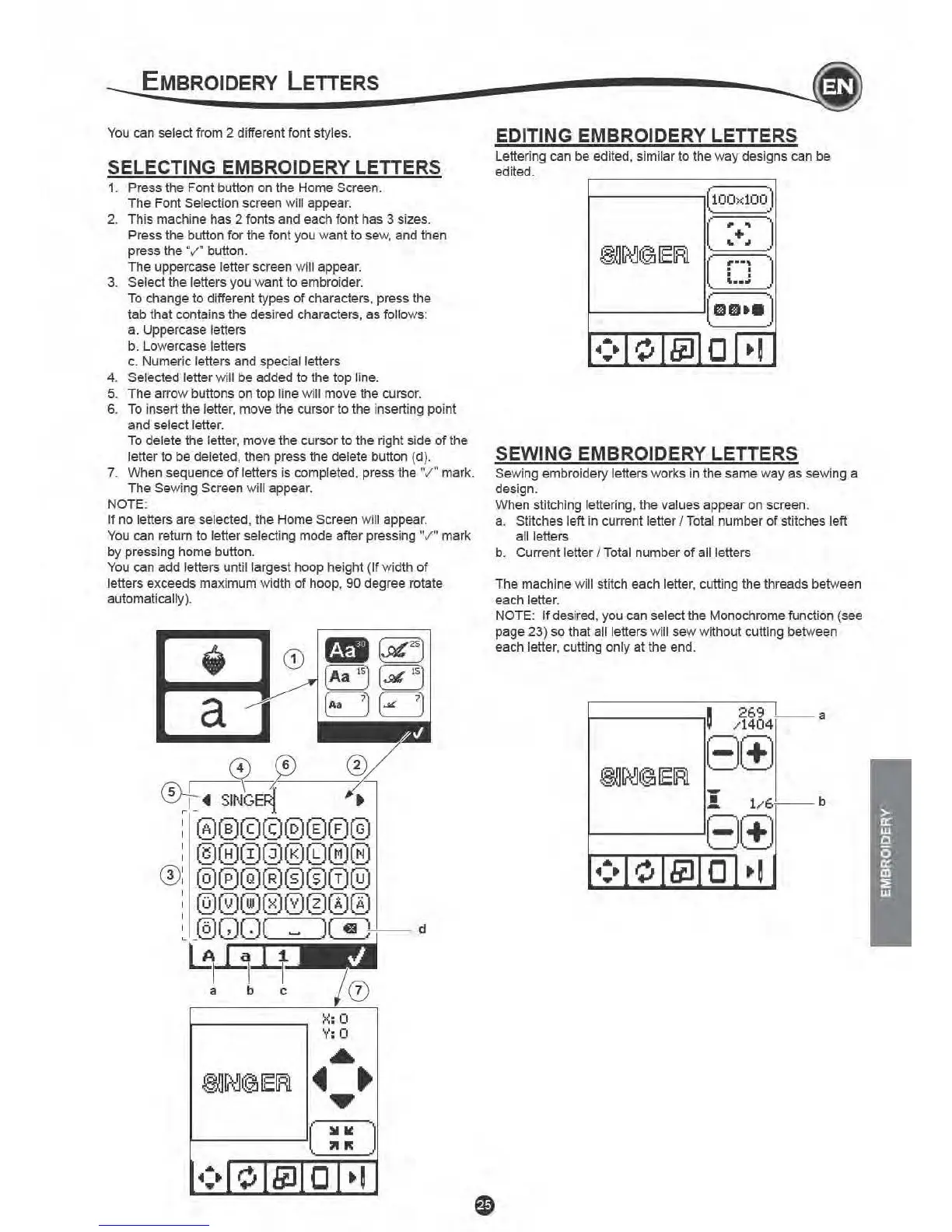 Singer EM200 - Embroidery Letters; Selecting Embroidery Letters; Sewing Embroidery Letters