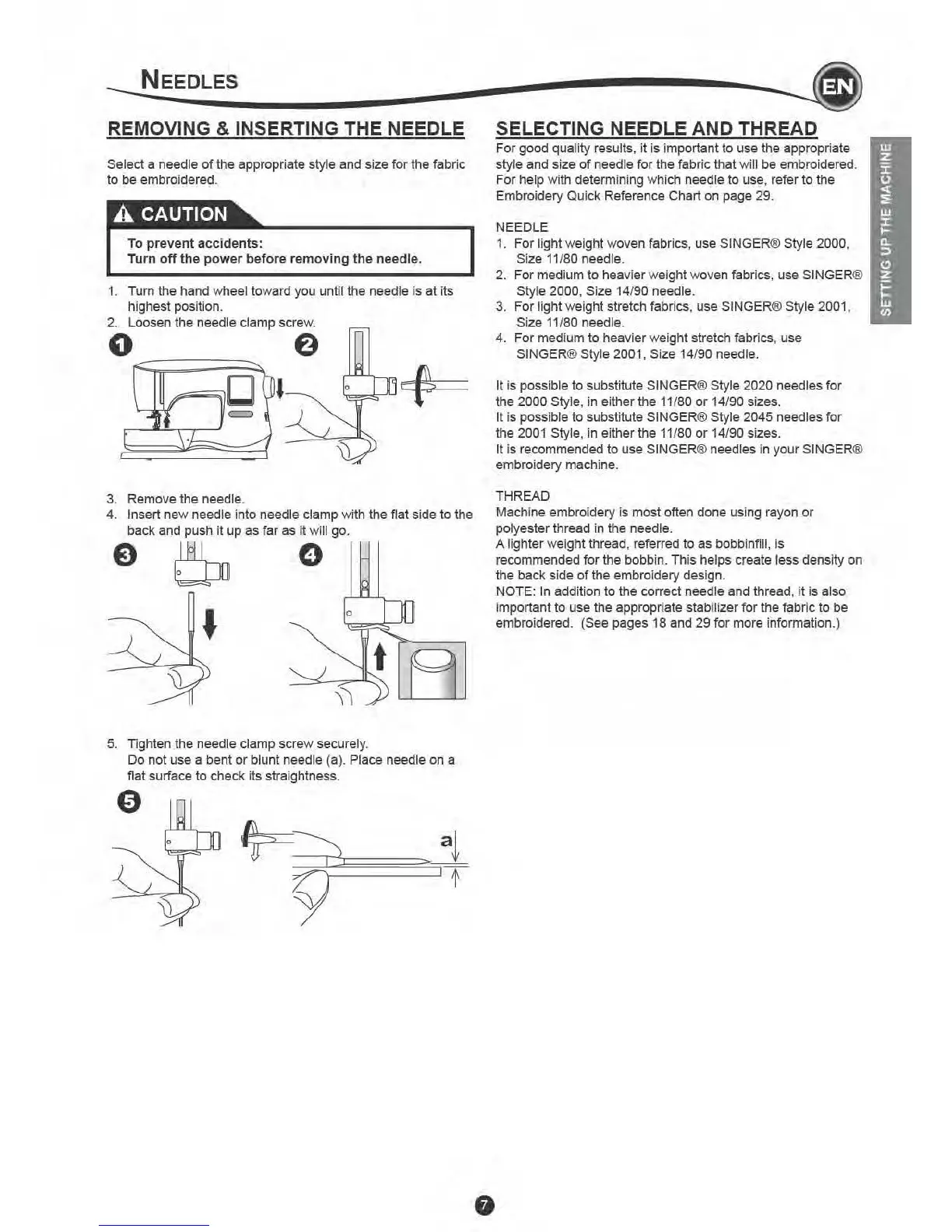 Singer EM200 - Needles; Removing & Inserting the Needle; Selecting Needle & Thread